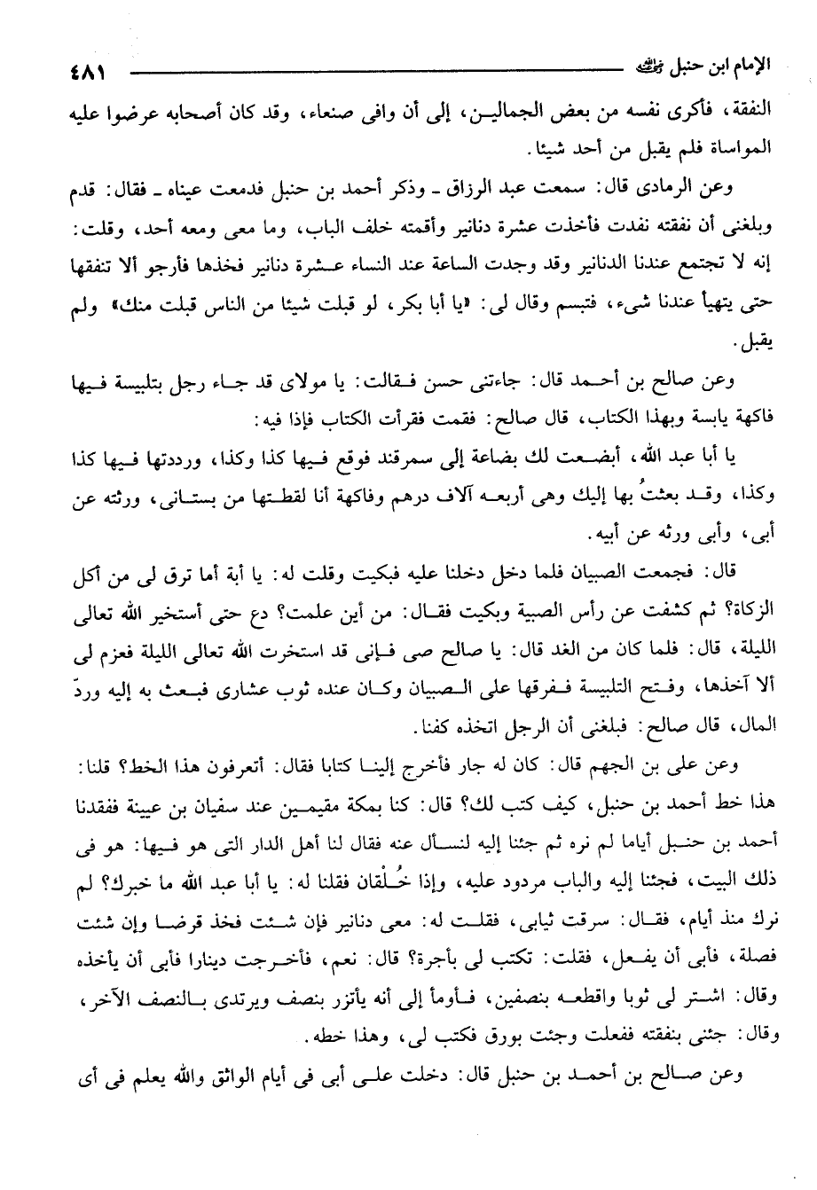 وعن علي بن الجهم قال كان له جار فاخرج الينا كتابا فقال اتعرفون هذا الخط قلنا هذا خط احمد بن حنبل كيف كتب لك قال كنا بمكة مقيمين عند سفيان بن عيينة ففقدنا احمد بن حنبل اياما لم نره ثم جئنا إليه لنسأل عنه فقال لنا أهل الدار التي هو فيها هو في ذلك البيت فجئنا إليه والباب مردود عليه واذا خلقان فقلنا له يا ابا عبد الله ما خبرك لم نرك منذ أيام فقال سرقت ثيابي. فقلت له معي دنانير فان شئت فخذ قرضا وان شئت فصلة فابى أن يفعل فقلت تكتب لي باجرة قال نعم فاخرجت دينارا فابى ان ياخذه وقال اشتر لي ثوبا واقطعه بنصفين فأومأ الي أنه يأتزر بنصف ويرتدي بالنصف الاخر وقال جئني بنفقته ففعلت وجئت بورق فكتب لي وهذا خطه.