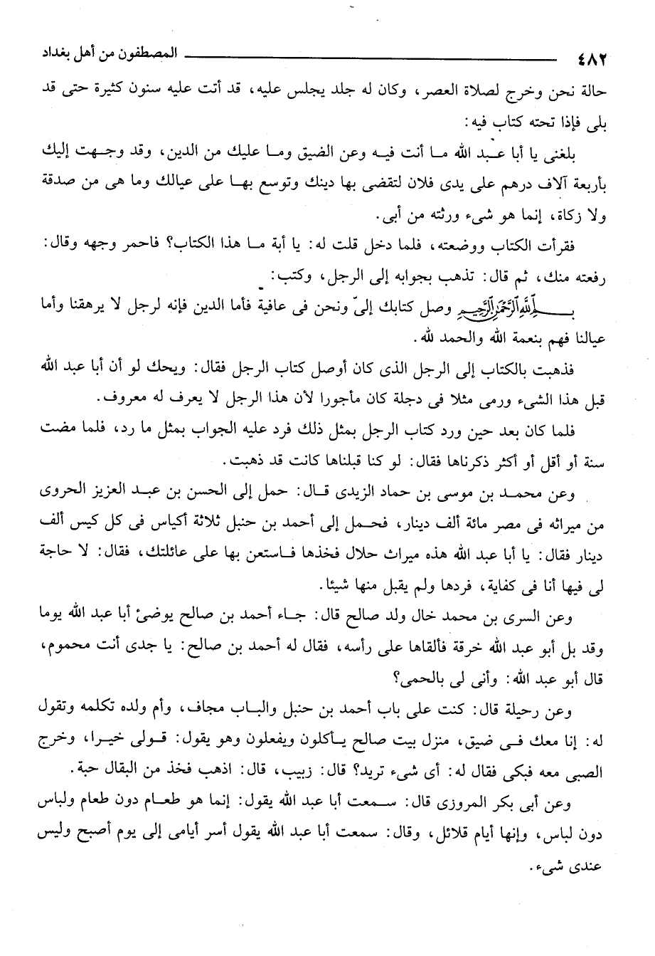 وعن محمد بن موسى بن حماد الزيدي قال حمل الى الحسن بن عبد العزيز الحروي من ميراثه من مصر مائة الف دينار فحمل إلي أحمد بن حنبل ثلاثة أكياس في كل كيس الف دينار فقال يا ابا عبد الله هذه ميراث حلال فخذها فاستعن بها على عائلتك فقال لا حاجة لي فيها انا في كفاية فردها ولم يقبل منها شيئا.