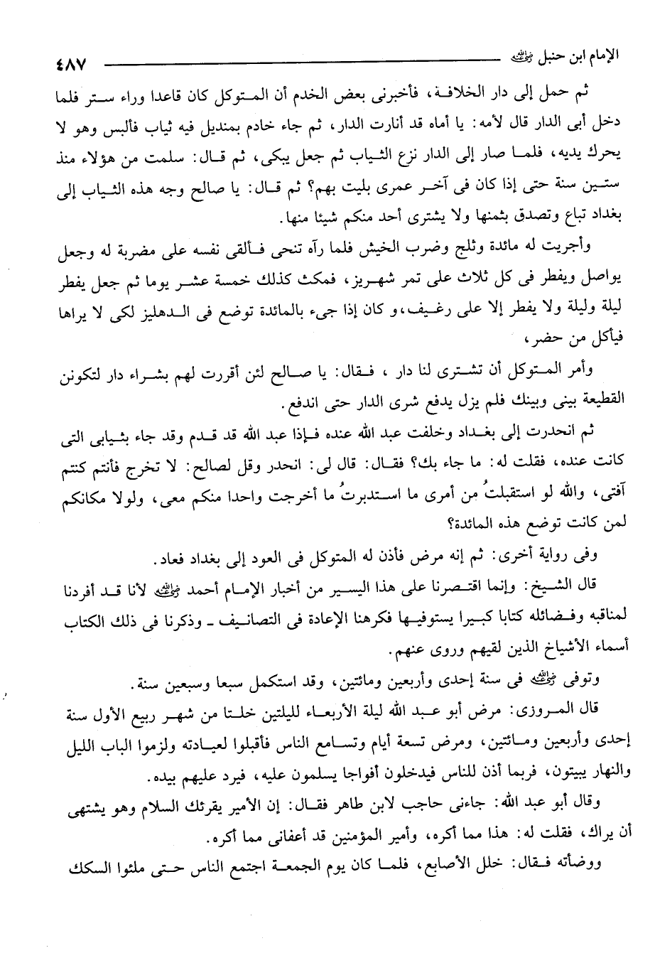 ثم حمل الى دار الخلافة فاخبرني بعض الخدم ان المتوكل كان قاعدا وراء ستر فلما دخل ابي الدار قال لامه يا اماه قد انارت الدار ثم جاء خادم بمنديل فيه ثياب فالبس وهو لا يحرك يديه فلما صار الى الدار نزع الثياب عنه ثم جعل يبكي ثم قال سلمت من هؤلاء منذ ستين سنة حتى اذا كان في آخر عمري بليت بهم ثم قال يا صالح وجه هذه الثياب الى بغداد تباع وتصدق بثمنها ولا يشتري احد منكم شيئا منها.