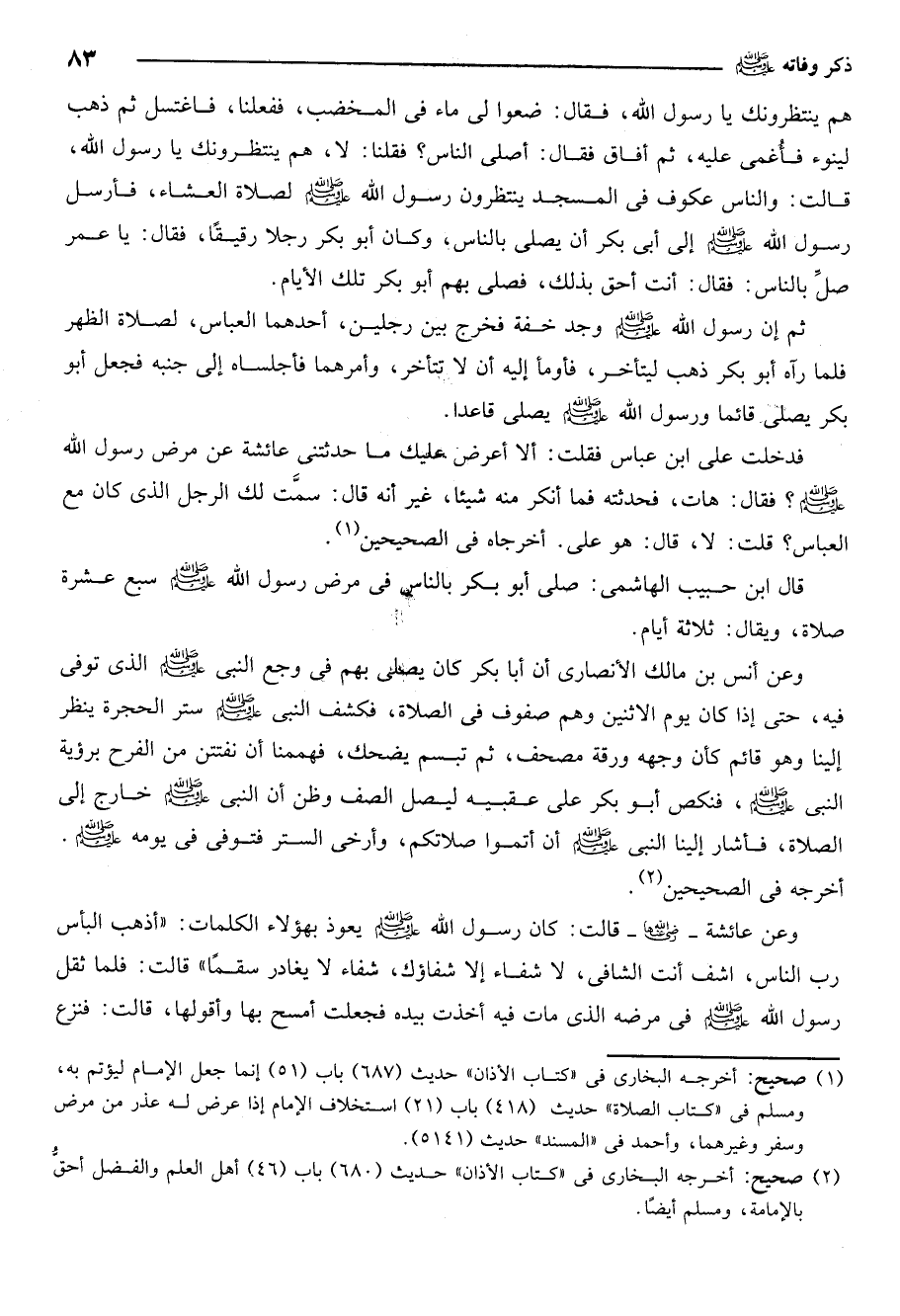 وعن أنس بن مالك الأنصاري: أن أبا بكر كان يصلي بهم في وجع رسول الله. صلى الله عليه وسلم الذي توفي فيه، حتى إذا كان يوم الاثنين وهم صفوف في الصلاة كشف رسول الله صلى الله عليه وسلم ستر الحجرة فنظر ألينا وهو قائم كأن وجهه ورقة مصحف، ثم تبسم رسول الله. صلى الله عليه وسلم ضاحكاً فبهتنا ونحن في الصلاة من فرح بخروج رسول الله صلى الله عليه وسلم ونكص أبو بكر على عقيبة ليصل الصف وظن ان رسول الله. صلى الله عليه وسلم خارج للصلاة، فأشار إليهم رسول الله. صلى الله عليه وسلم بيده أن أتموا صلاتكم قال: ثم دخل رسول الله صلى الله عليه وسلم فأرخى الستر قال: فتوفي رسول الله صلى الله عليه وسلم من يومه ذلك أخرجاه في الصحيحين2.