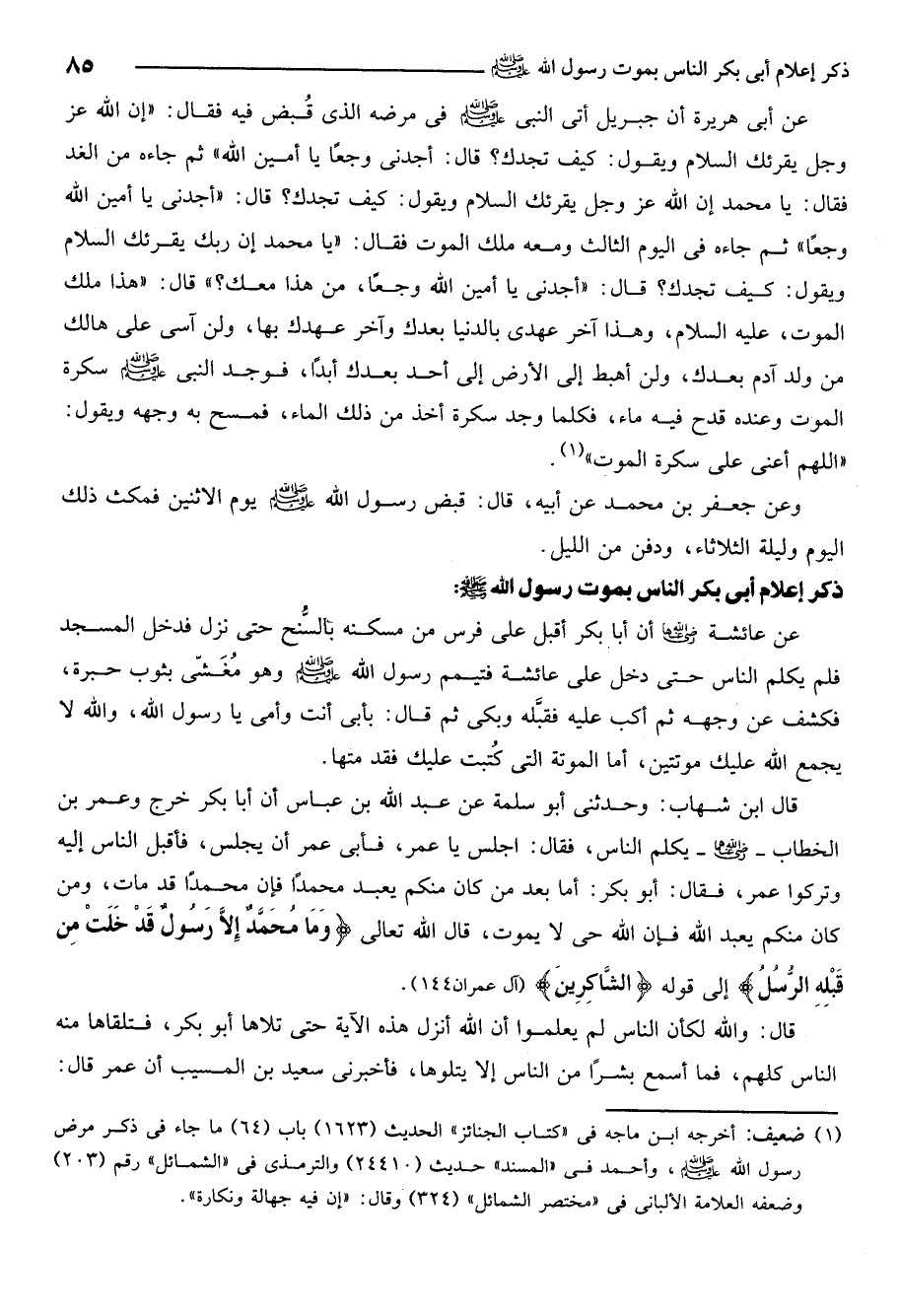 1 ضعيف: أخرجه ابن ماجة في كتاب الجنائز الحديث 1623. باب 64. ماجاء في ذكر مرض رسول الله صلى الله عليه وسلموأحمد في المسند حديث 24410. والترمذي في الشمائل رقم 203. وضعفه العلامة الالباني في مختصر الشمائل 324. وقال: إن فيه جهالة ونكارة.