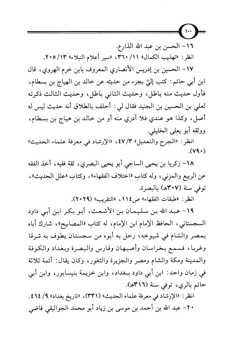 18 - زكريا بن يحيى الساجي أبو يحيى البصري، ثقة فقيه، أخذ الفقه عن الربيع والمزني، وله كتاب "اختلاف الفقهاء"، وكتاب "علل الحديث"، توفي سنة (307 هـ) بالبصرة.