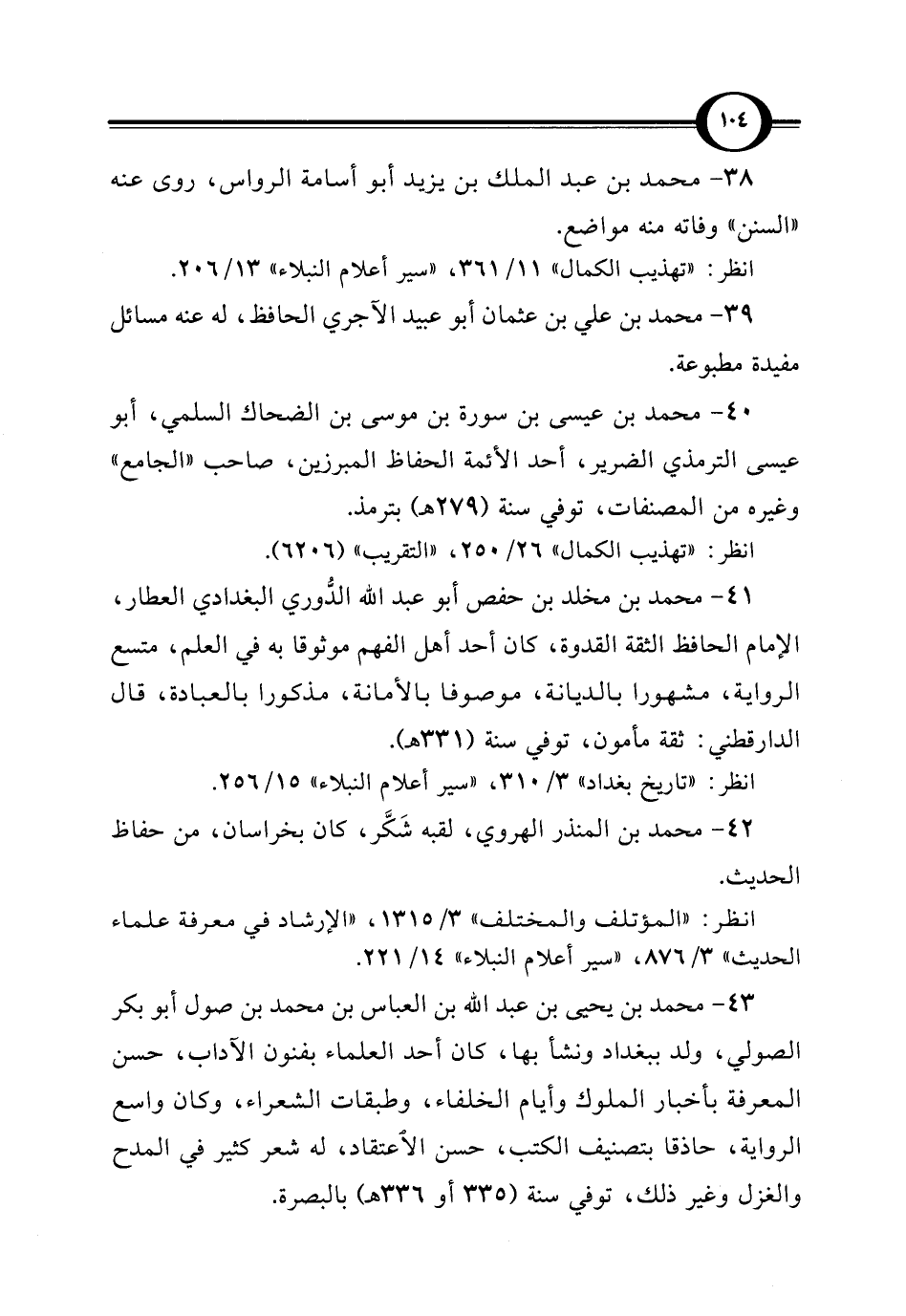 40 - محمد بن عيسى بن سورة بن موسى بن الضحاك السلمي، أبو عيسى الترمذي الضرير، أحد الأئمة الحفاظ المبرزين، صاحب "الجامع" وغيره من المصنفات، توفي سنة (279 هـ) بترمذ.