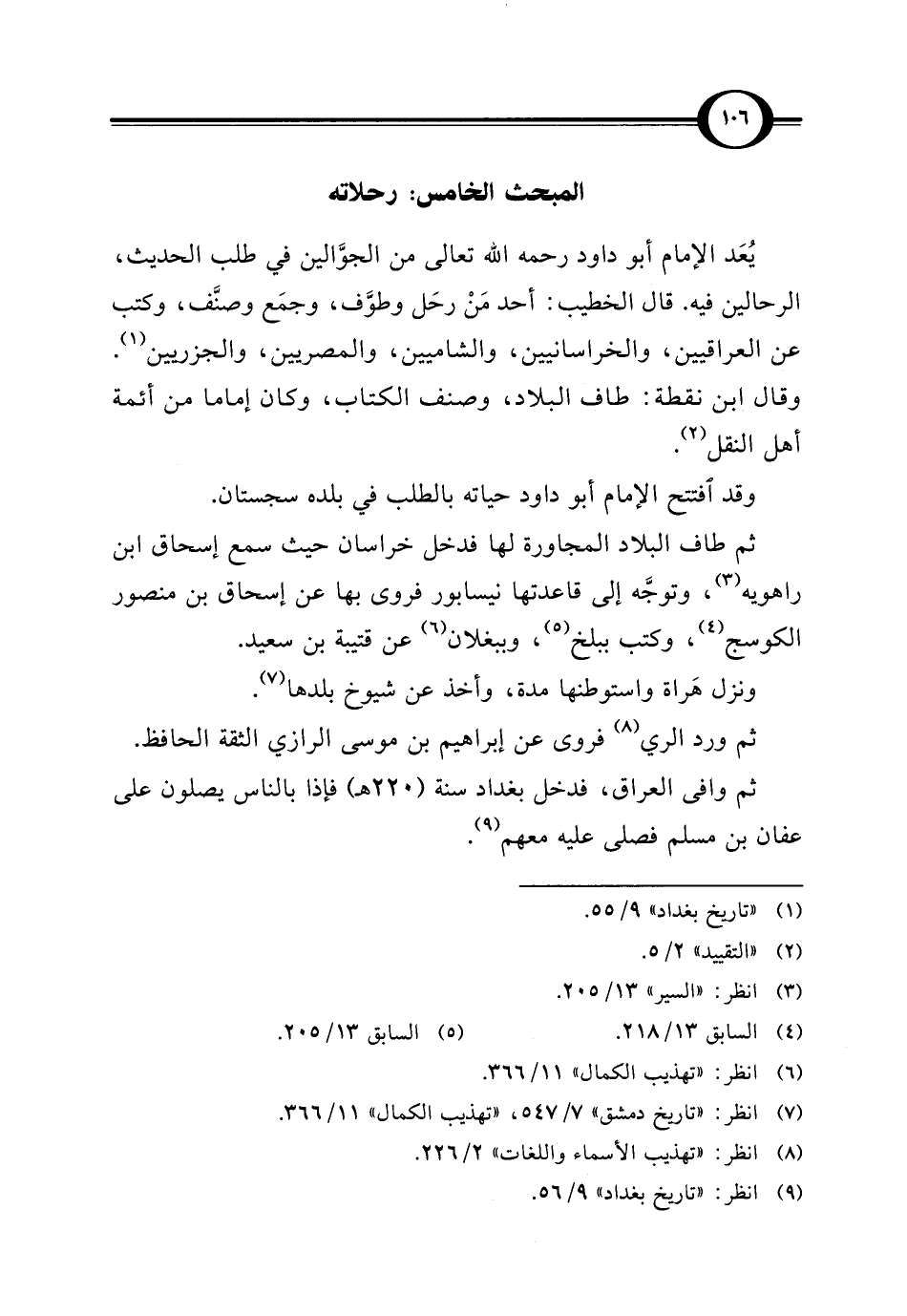 يُعَد الإمام أبو داود رحمه الله تعالى من الجوَّالين في طلب الحديث، الرحالين فيه. قال الخطيب: أحد مَنْ رحَل وطوَّف، وجمَع وصنَّف، وكتب عن العراقيين، والخراسانيين، والشاميين، والمصريين، والجزريين (¬1).