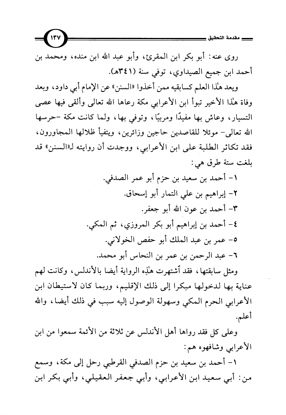 ويعد هذا العلم كسابقيه ممن أخذوا "السنن" عن الإمام أبي داود، وبعد وفاة هذا الأخير تبوأ ابن الأعرابي مكة رعاها الله تعالى وألقى فيها عصى التسيار، وعاش بها مفيدًا ومربيًا، وتوفي بها، ولما كانت مكة -حرسها الله تعالى- موئلا للقاصدين حاجين وزائرين، ويتفيأ ظلالها المجاورون، فقد تكاثر الطلبة على ابن الأعرابي، ووجدت أن روايته لـ"السنن" قد بلغت ستة طرق هي: