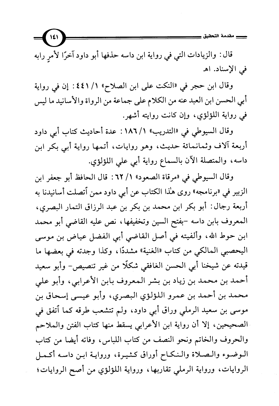 وقال ابن حجر في "النكت على ابن الصلاح" 1/ 441: إن في رواية أبي الحسن بن العبد عنه من الكلام على جماعة من الرواة والأسانيد ما ليس في رواية اللؤلؤي، وإن كانت روايته أشهر.