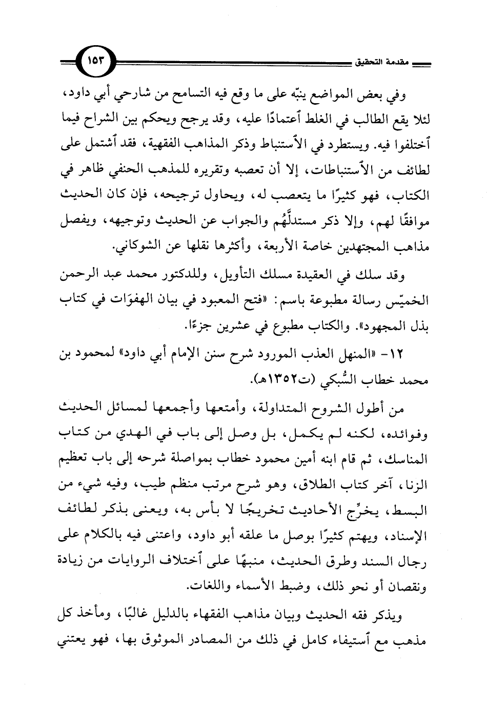 وفي بعض المواضع ينبّه على ما وقع فيه التسامح من شارحي أبي داود، لئلا يقع الطالب في الغلط اعتمادًا عليه، وقد يرجح ويحكم بين الشراح فيما اختلفوا فيه. ويستطرد في الاستنباط وذكر المذاهب الفقهية، فقد اشتمل على لطائف من الاستنباطات، إلا أن تعصبه وتقريره للمذهب الحنفي ظاهر في الكتاب، فهو كثيرًا ما يتعصب له، ويحاول ترجيحه، فإن كان الحديث موافقًا لهم، وإلا ذكر مستدلَّهُم والجواب عن الحديث وتوجيهه، ويفصل مذاهب المجتهدين خاصة الأربعة، وأكثرها نقلها عن الشوكاني.