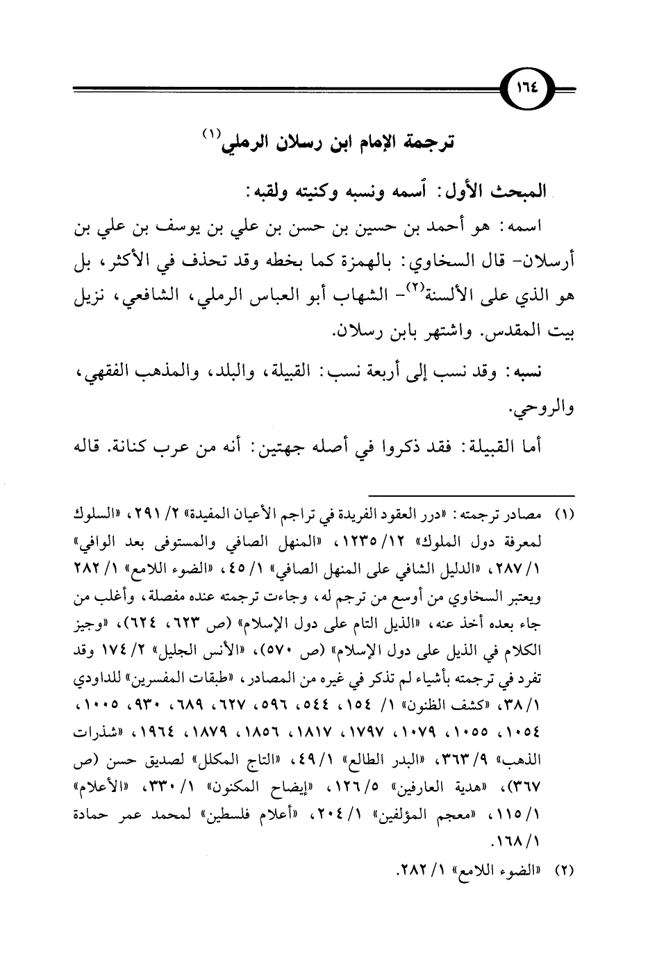 اسمه: هو أحمد بن حسين بن حسن بن علي بن يوسف بن علي بن أرسلان -قال السخاوي: بالهمزة كما بخطه وقد تحذف في الأكثر، بل هو الذي على الألسنة (¬2) - الشهاب أبو العباس الرملي، الشافعي، نزيل بيت المقدس. واشتهر بابن رسلان.