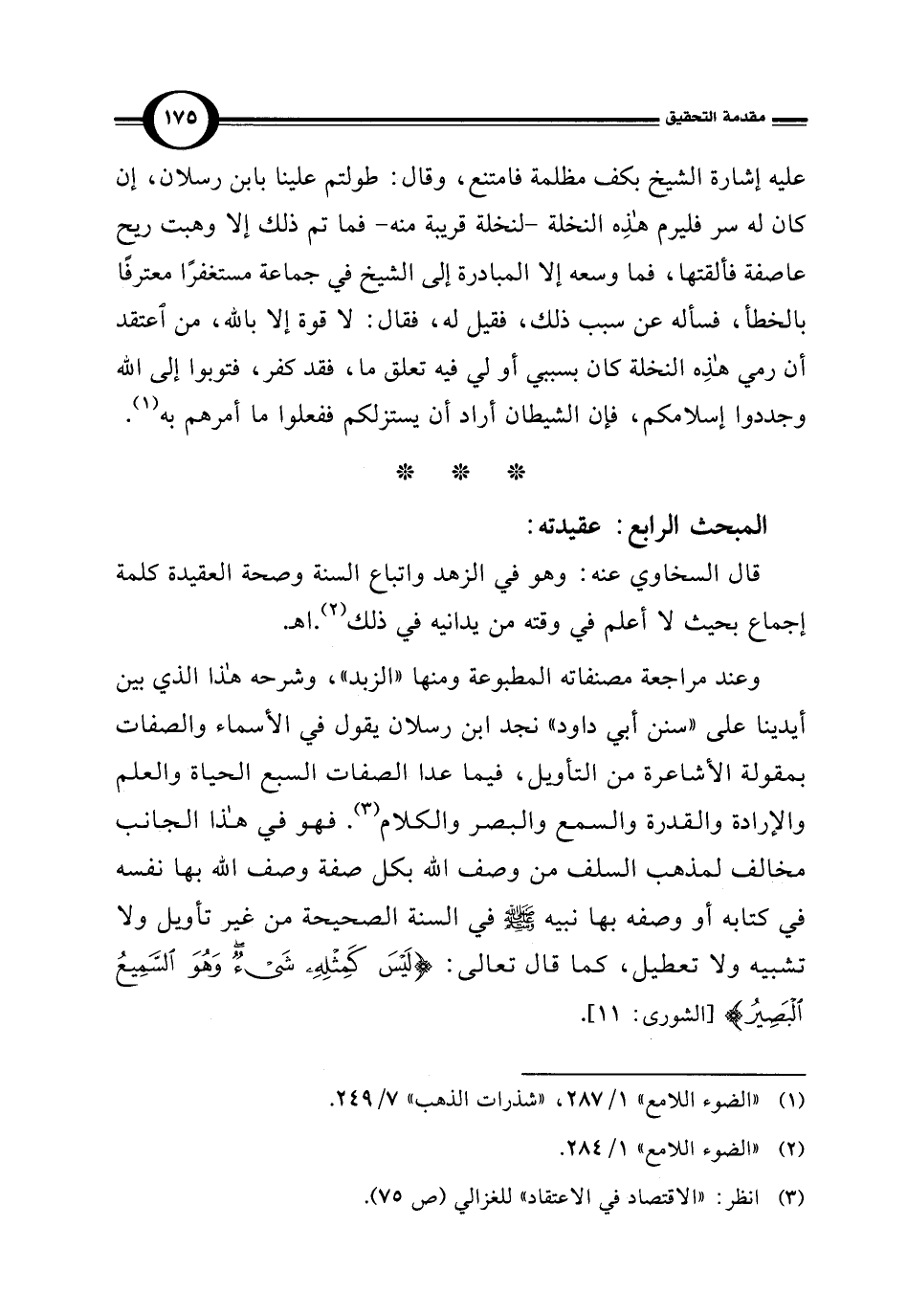 وعند مراجعة مصنفاته المطبوعة ومنها "الزبد"، وشرحه هذا الذي بين أيدينا على "سنن أبي داود" نجد ابن رسلان يقول في الأسماء والصفات بمقولة الأشاعرة من التأويل، فيما عدا الصفات السبع الحياة والعلم والإرادة والقدرة والسمع والبصر والكلام (¬3). فهو في هذا الجانب مخالف لمذهب السلف من وصف الله بكل صفة وصف الله بها نفسه في كتابه أو وصفه بها نبيه -صلى الله عليه وسلم- في السنة الصحيحة من غير تأويل ولا تشبيه ولا تعطيل، كما قال تعالى: {لَيْسَ كَمِثْلِهِ شَيْءٌ وَهُوَ السَّمِيعُ الْبَصِيرُ} [الشورى: 11].