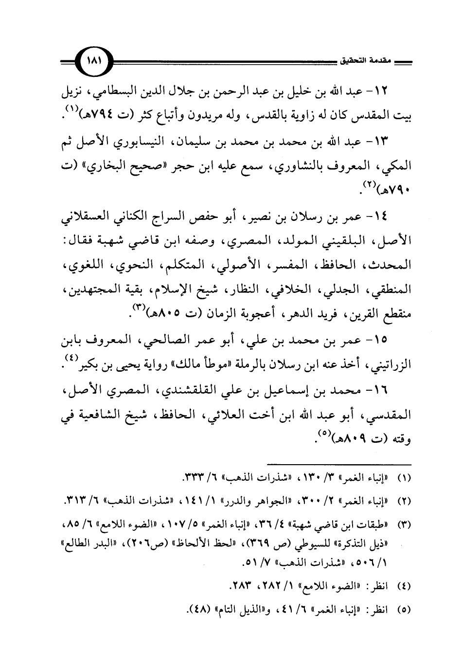 (¬3) "طبقات ابن قاضي شهبة" 4/ 36، "إنباء الغمر" 5/ 107، "الضوء اللامع" 6/ 85، "ذيل التذكرة" للسيوطي (ص 369)، "لحظ الألحاظ" (ص 206)، "البدر الطالع" 1/ 506، "شذرات الذهب" 7/ 51.
