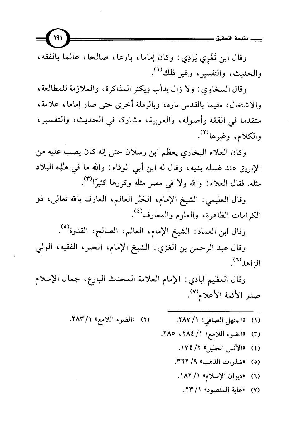 وكان العلاء البخاري يعظم ابن رسلان حتى إنه كان يصب عليه من الإبريق عند غسله يديه، وقال له ابن أبي الوفاء: والله ما في هذِه البلاد مثله. فقال العلاء: والله ولا في مصر مثله وكررها كثيرًا (¬3).
