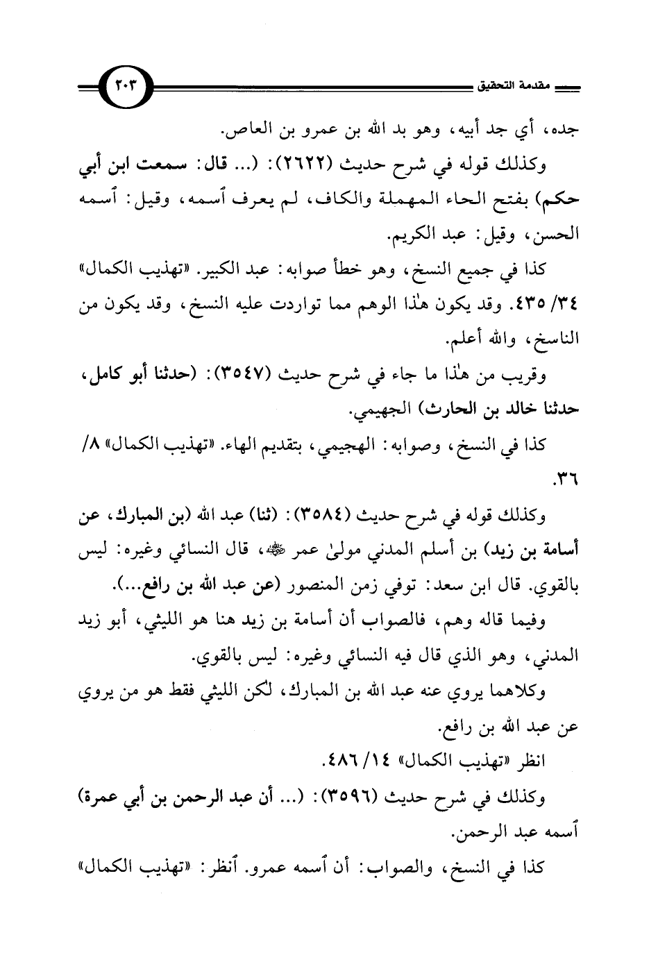 وكذلك قوله في شرح حديث (3584): (ثنا) عبد الله (بن المبارك، عن أسامة بن زيد) بن أسلم المدني مولى عمر - رضي الله عنه -، قال النسائي وغيره: ليس بالقوي. قال ابن سعد: توفي زمن المنصور (عن عبد الله بن رافع. . .).