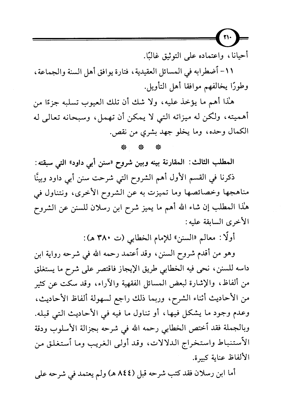 ذكرنا في القسم الأول أهم الشروح التي شرحت سنن أبي داود وبينَّا مناهجها وخصائصها وما تميزت به عن الشروح الأخرى، ونتناول في هذا المطلب إن شاء الله أهم ما يميز شرح ابن رسلان للسنن عن الشروح الأخرى السابقة عليه:
