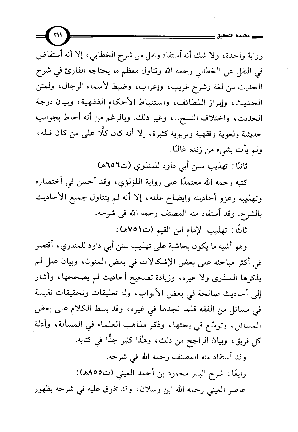 وهو أشبه ما يكون بحاشية على تهذيب سنن أبي داود للمنذري، اقتصر في أكثر مباحثه على بعض الإشكالات في بعض المتون، وبيان علل لم يذكرها المنذري ولا غيره، وزيادة تصحيح أحاديث لم يصححها، وأشار إلى أحاديث صالحة في بعض الأبواب، وله تعليقات وتحقيقات نفيسة في مسائل من الفقه قلما نجدها في غيره، وقد بسط الكلام على بعض المسائل، وتوسّع في بحثها، وذكر مذاهب العلماء في المسألة، وأدلة كل فريق، وبيان الراجح من ذلك، وهذا كثير جدًّا في كتابه.