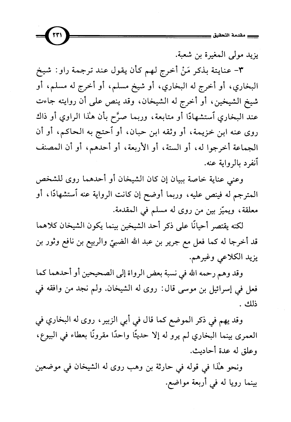 وعني عناية خاصة ببيان إن كان الشيخان أو أحدهما روى للشخص المترجم له فينص عليه، وربما أوضح إن كانت الرواية عنه استشهادًا، أو معلقة، ويميّز بين من روى له مسلم في المقدمة.