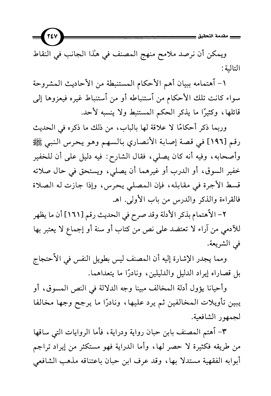 3 - اهتم المصنف بابن حبان رواية ودراية، فأما الروايات التي ساقها من طريقه فكثيرة لا حصر لها، وأما الدراية فهو مستكثر من إيراد تراجم أبوابه الفقهية مستدلا بها، وقد عرف ابن حبان باعتناقه مذهب الشافعي