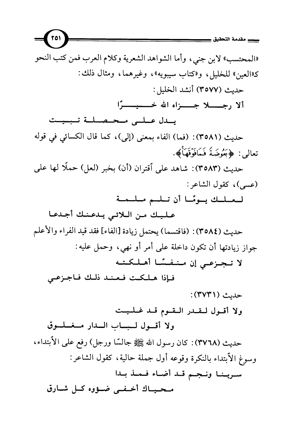 "المحتسب" لابن جني، وأما الشواهد الشعرية وكلام العرب فمن كتب النحو كـ"العين" للخليل، و"كتاب سيبويه"، وغيرهما، ومثال ذلك: