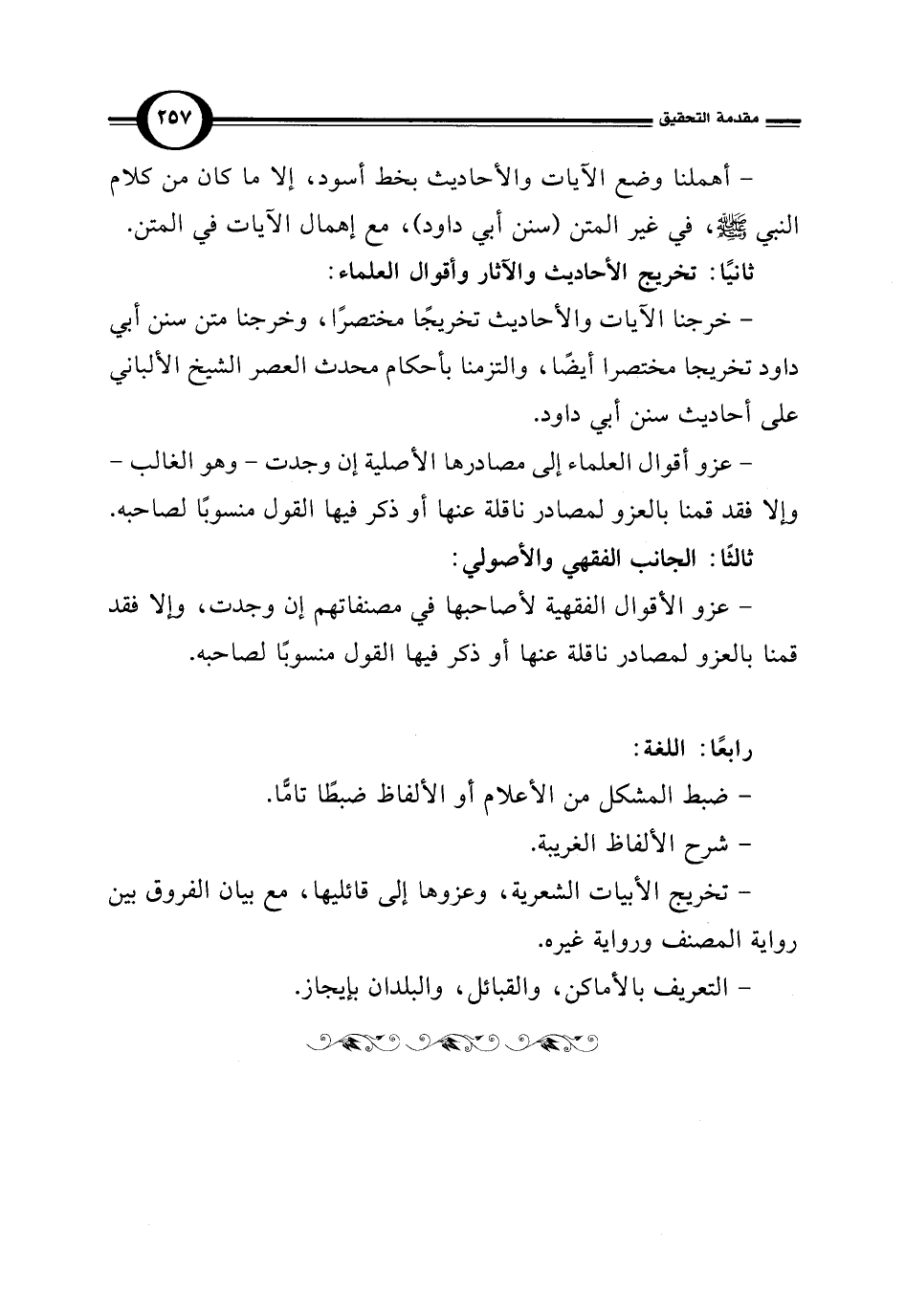 - أهملنا وضع الآيات والأحاديث بخط أسود، إلا ما كان من كلام النبي -صلى الله عليه وسلم-، في غير المتن (سنن أبي داود)، مع إهمال الآيات في المتن.