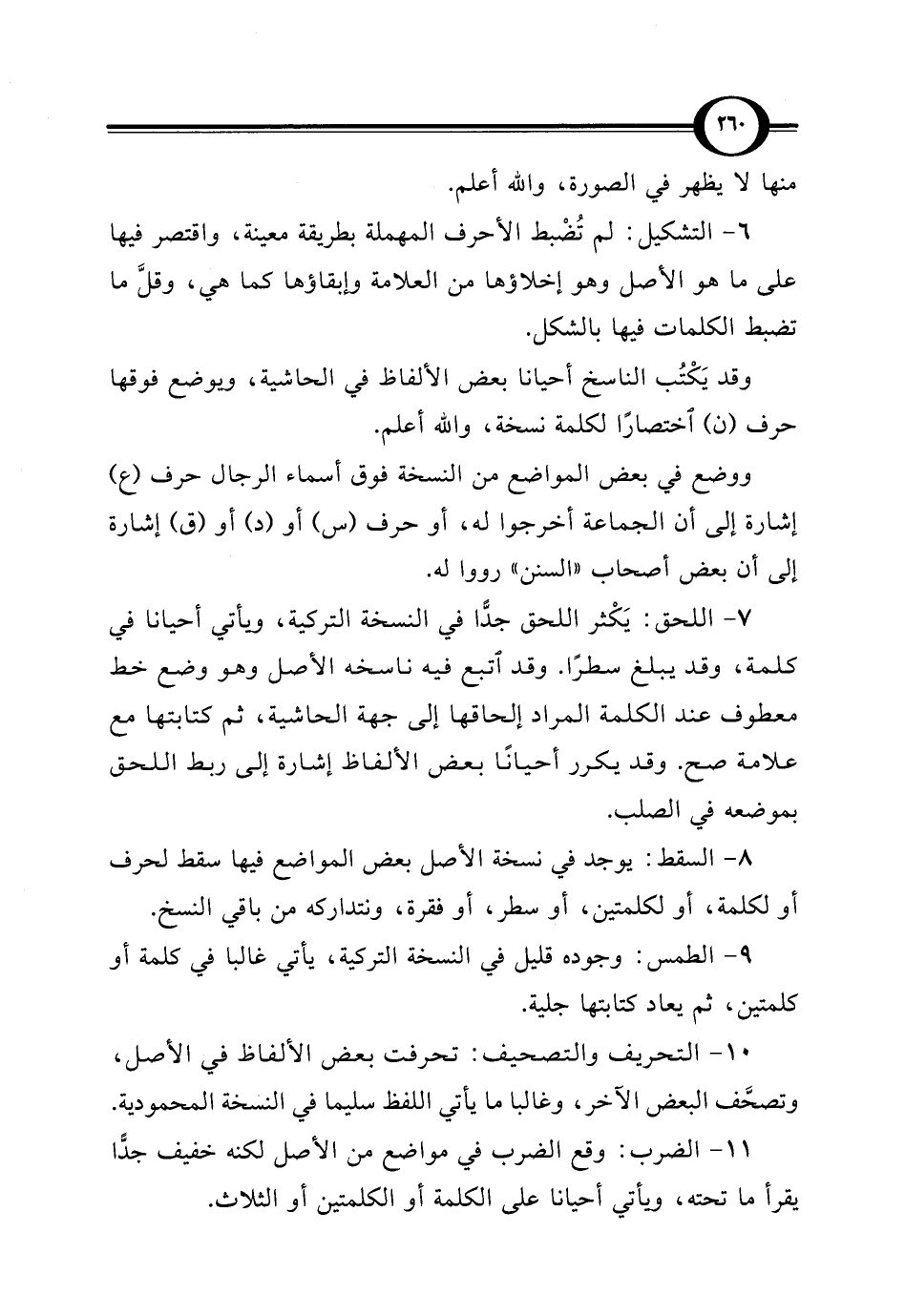 8 - السقط: يوجد في نسخة الأصل بعض المواضع فيها سقط لحرف أو لكلمة، أو لكلمتين، أو سطر، أو فقرة، ونتداركه من باقي النسخ.
