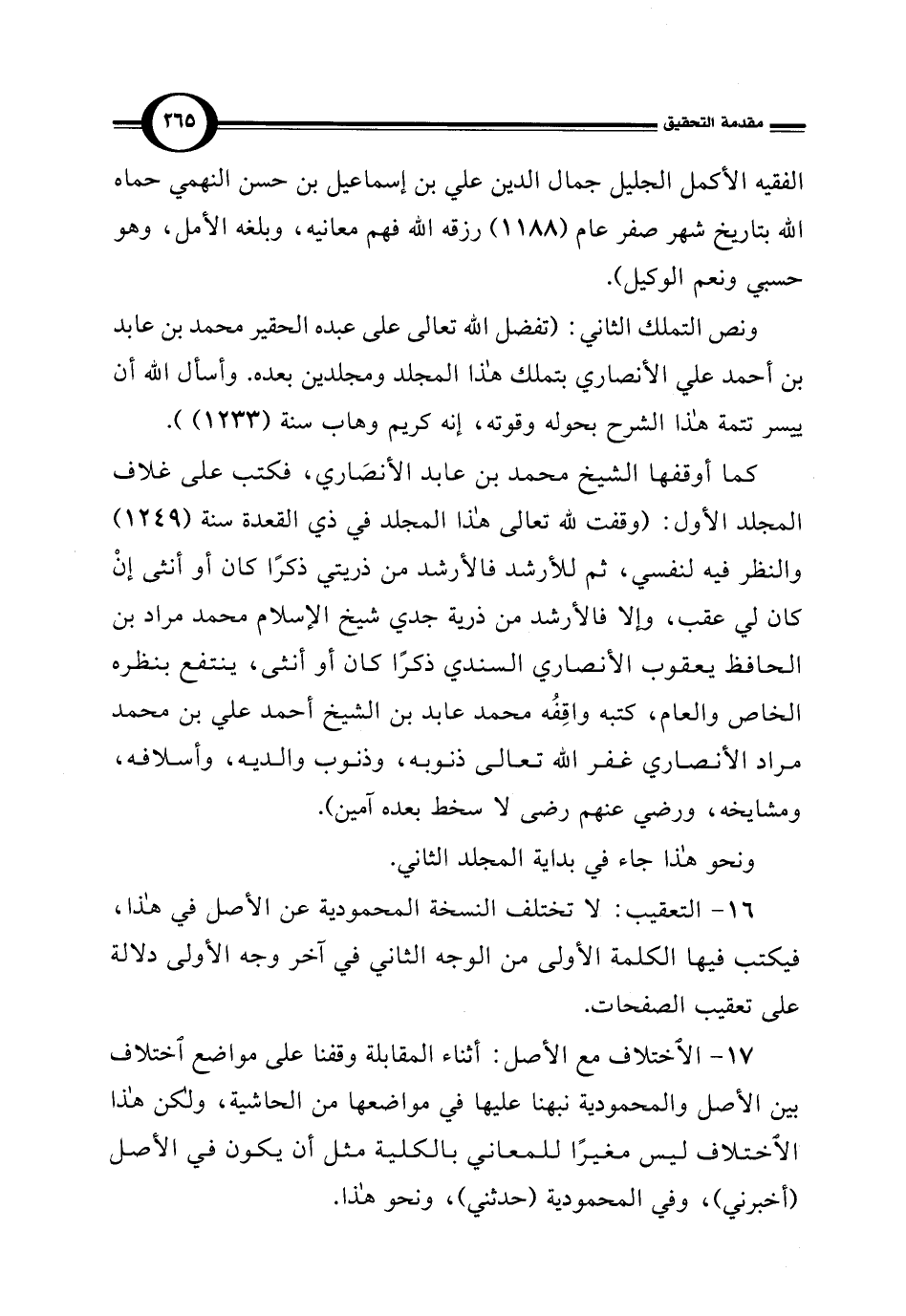 17 - الاختلاف مع الأصل: أثناء المقابلة وقفنا على مواضع اختلاف بين الأصل والمحمودية نبهنا عليها في مواضعها من الحاشية، ولكن هذا الاختلاف ليس مغيرًا للمعاني بالكلية مثل أن يكون في الأصل (أخبرني)، وفي المحمودية (حدثني)، ونحو هذا.