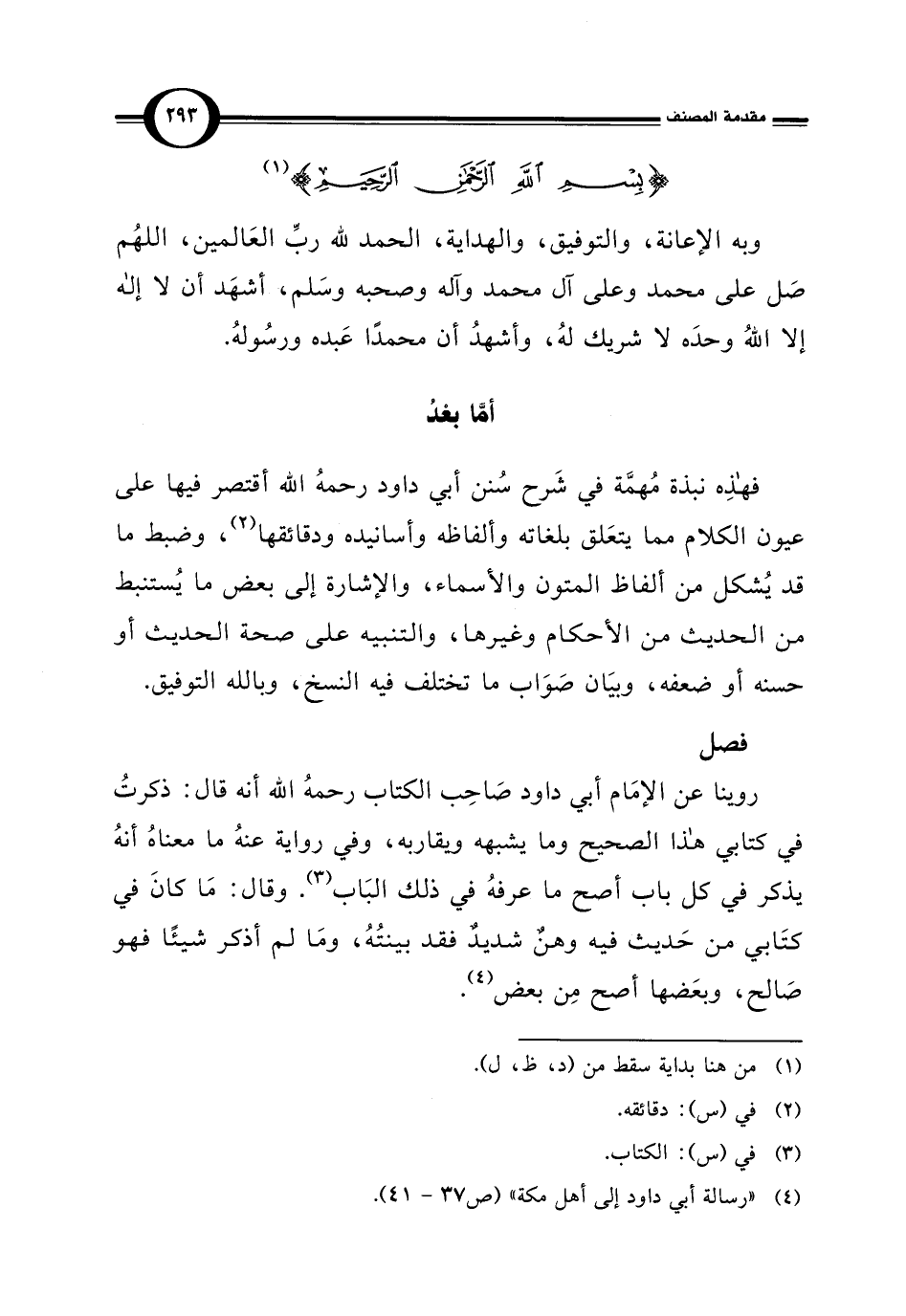 فهذِه نبذة مُهمَّة في شَرح سُنن أبي داود رحمهُ الله أقتصر فيها على عيون الكلام مما يتعَلق بلغاته وألفاظه وأسانيده ودقائقها (¬2)، وضبط ما قد يُشكل من ألفاظ المتون والأسماء، والإشارة إلى بعض ما يُستنبط من الحديث من الأحكام وغيرها، والتنبيه على صحة الحديث أو حسنه أو ضعفه، وبيَان صَوَاب ما تختلف فيه النسخ، وبالله التوفيق.