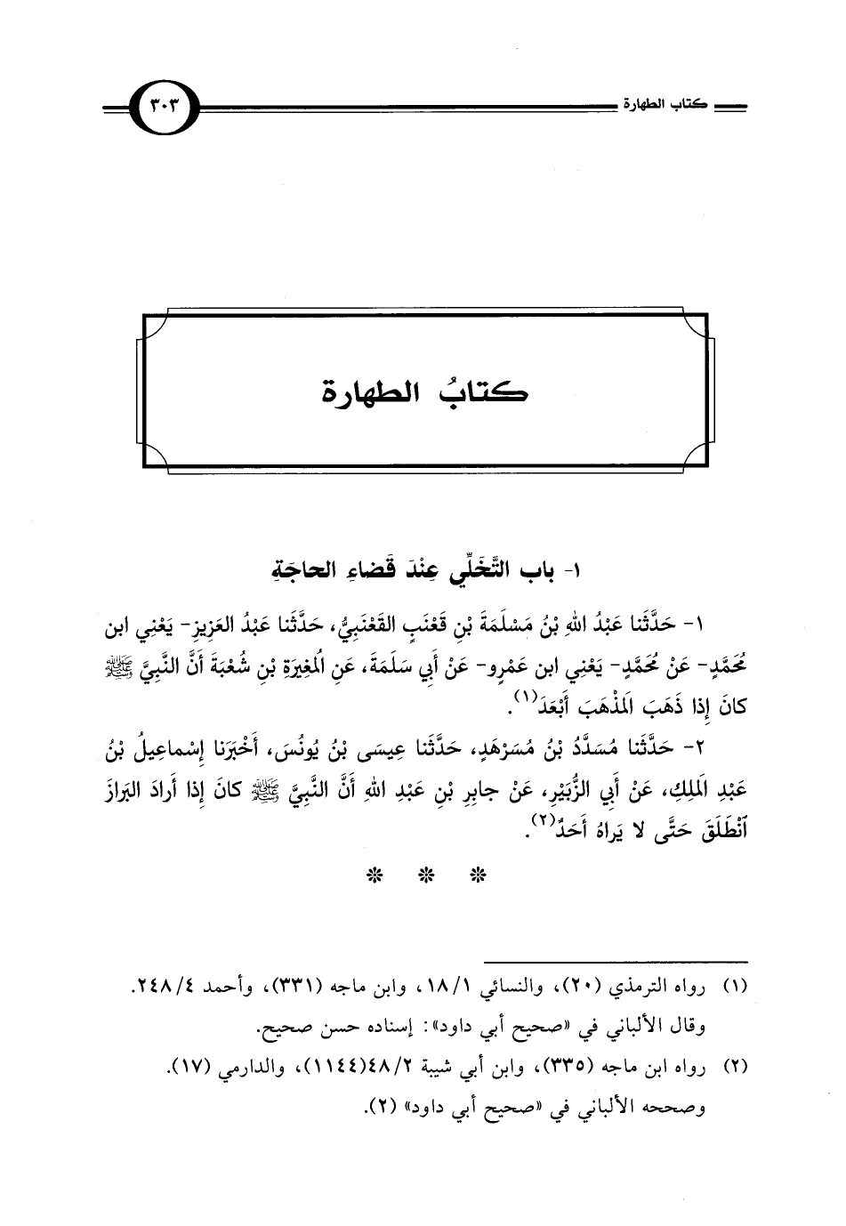 1 - حَدَّثَنا عَبْدُ اللهِ بْنُ مَسْلَمَةَ بْنِ قَعْنَبٍ القَعْنَبِيُّ، حَدَّثَنا عَبْدُ العَزِيزِ - يَعْنِي ابن مُحَمَّدٍ - عَنْ محَمَّدٍ - يَعْنِي ابن عَمْرٍو - عَنْ أَبي سَلَمَةَ، عَنِ الْمُغِيرَةِ بْنِ شُعْبَةَ أَنَّ النَّبِيَّ - صلى الله عليه وسلم - كانَ إِذا ذَهَبَ المَذْهَبَ أَبْعَدَ (¬1).