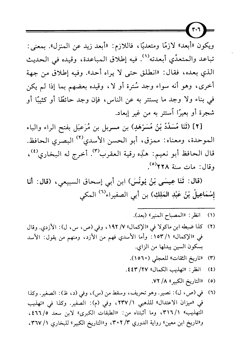 [2] (ثَنَا مُسَدَّدُ بْنُ مُسَرْهَدٍ) بن مسربل بن مُرَعبَل بفتح الراء والباء الموحدة، ومعناه: ممزق، أبو الحسن الأسدي (¬2) البصري الحافظ. قال الحافظ أبو نعيم: هذِه رقية العقرب (¬3). أخرج له البخاري (¬4)، وقال: مات سنة 228 (¬5).