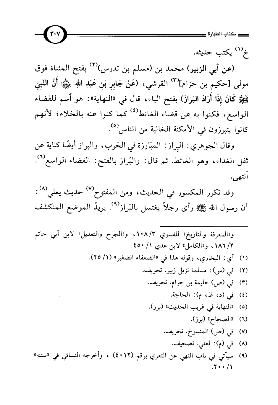 وقد تكرر المكسور في الحديث، ومن المفتوح (¬7) حديث يعلى (¬8): أن رسول الله - صلى الله عليه وسلم - رأى رجلًا يغتسل بالبَراز (¬9). يريدُ الموضع المنكشف