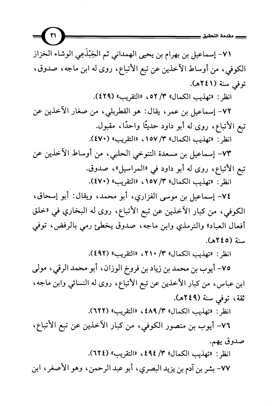71 - إسماعيل بن بهرام بن يحيى الهمداني ثم الخِبْذَعِي الوشاء الخزاز الكوفي، من أوساط الآخذين عن تبع الأتباع، روى له ابن ماجة، صدوق، توفي سنة (241 هـ).