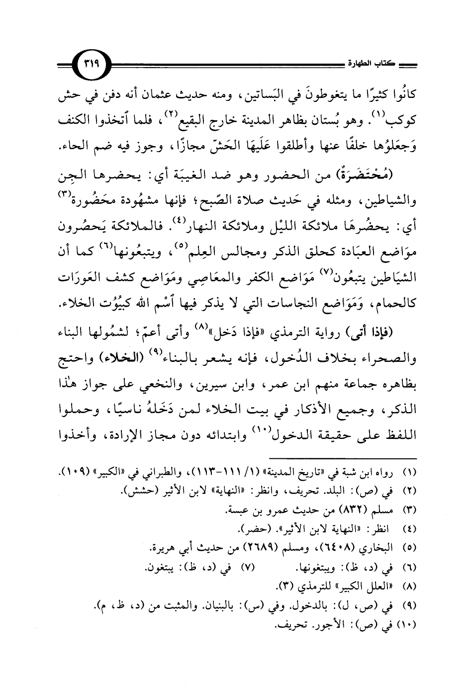 (مُحْتَضَرَةٌ) من الحضور وهو ضد الغيبَة أي: يحضرها الجِن والشياطين، ومثله في حَديث صلاة الصُّبح؛ فإنها مشهُودة محَضُورة (¬3) أي: يحضرهَا ملائكة الليْل وملائكة النهار (¬4). فالملائكة يَحصُرون موَاضع العبَادة كحلق الذكر ومجالس العِلم (¬5)، ويتبعُونها (¬6) كما أن الشيَاطين يتبعُون (¬7) مَوَاضع الكفر والمعَاصِي ومَوَاضع كشف العَورَات كالحمام، وَمَوَاضع النجاسات التي لا يذكر فيها اسْم الله كبيُوُت الخلاء.