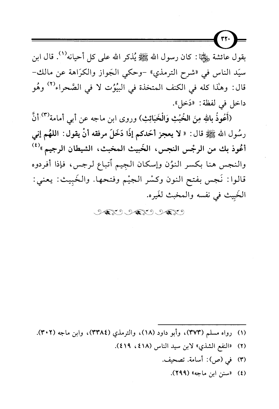 (أَعُوذُ بالله مِنَ الخُبُثِ وَالْخَبَائِثِ) وروى ابن ماجة عن أبي أمامة (¬3) أنَّ رسُول الله - صلى الله عليه وسلم - قال: "لا يعجز أحَدكم إذَا دَخَلَ مرفقه أنْ يقول: اللهُم إني أعُوذ بك من الرجْس النجس، الخَبيث المخبث، الشيطان الرجيم" (¬4) والنجس هنا بكسر النُون وإسكان الجِيم اتباع لرجس، فإذا أفردوه قالوا: نَجس بفتح النون وكسْر الجيم وفتحها. والخَبِيث: يعني: الخَبِيث في نفسه والمخبث لغَيره.