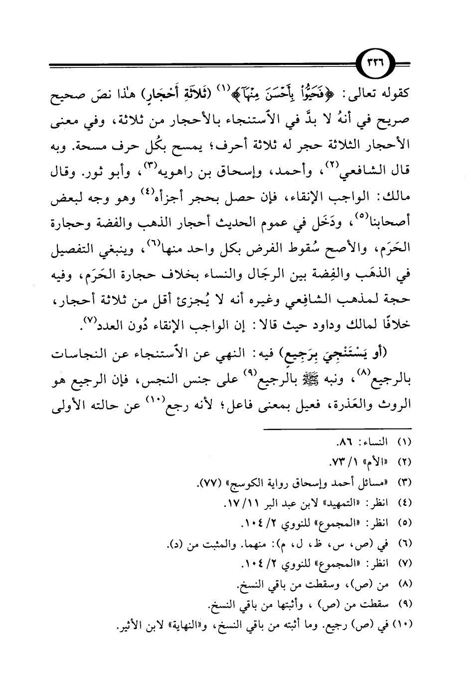 كقوله تعالى: {فَحَيُّوا بِأَحْسَنَ مِنْهَا} (¬1) (ثَلَاثةِ أَحْجَارٍ) هذا نصَ صحيح صريح في أنهُ لا بدَّ في الاستنجاء بالأحجار من ثلاثة، وفي معنى الأحجار الثلاثة حجر له ثلاثة أحرف؛ يمسح بكُل حرف مسحة. وبه قال الشافعي (¬2)، وأحمد، وإسحاق بن راهويه (¬3)، وأبو ثور. وقال مالك: الواجب الإنقاء، فإن حصل بحجر أجزأه (¬4) وهو وجه لبعض أصحابنا (¬5)، ودَخَل في عموم الحديث أحجار الذهب والفضة وحجارة الحَرَم، والأصح سُقوط الفرض بكل واحد منها (¬6)، وينبغي التفصيل في الذهَب والفِضة بين الرجَال والنساء بخلاف حجارة الحَرَم، وفيه حجة لمذهب الشافِعي وغيره أنه لا يُجزئ أقل من ثلاثة أحجار، خلافًا لمالك وداود حيث قالا: إن الواجب الإنقاء دُون العدد (¬7).