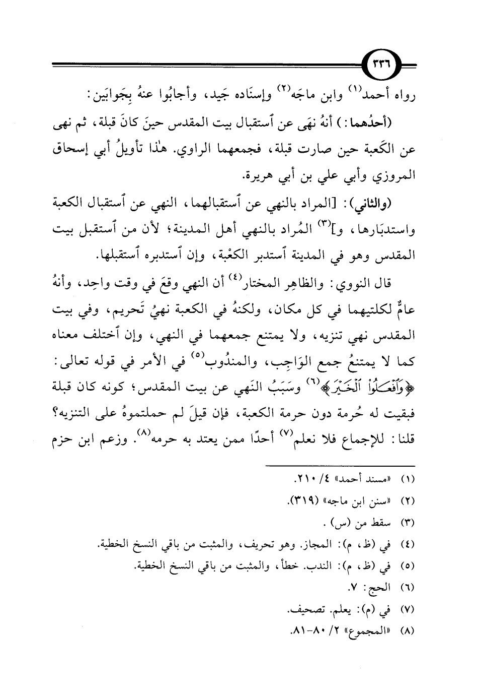 قال النووي: والظاهِر المختار (¬4) أن النهي وقعَ في وقت واحِد، وأنهُ عامٌّ لكلتيهما في كل مكان، ولكنهُ في الكعبة نهيُ تَحريم، وفي بيت المقدس نهي تنزيه، ولا يمتنع جمعهما في النهي، وإن اختلف معناه كما لا يمتنعُ جمع الوَاجِب، والمندُوب (¬5) في الأمر في قوله تعالى: {وَافْعَلُوا الْخَيْرَ} (¬6) وسَبَبُ النَهي عن بيت المقدس، كونه كان قبلة فبقيت له حُرمة دون حرمة الكعبة، فإن قيلَ لم حملتموهُ على التنزيه؟ قلنا: للإجماع فلا نعلم (¬7) أحدًا ممن يعتد به حرمه (¬8). وزعم ابن حزم