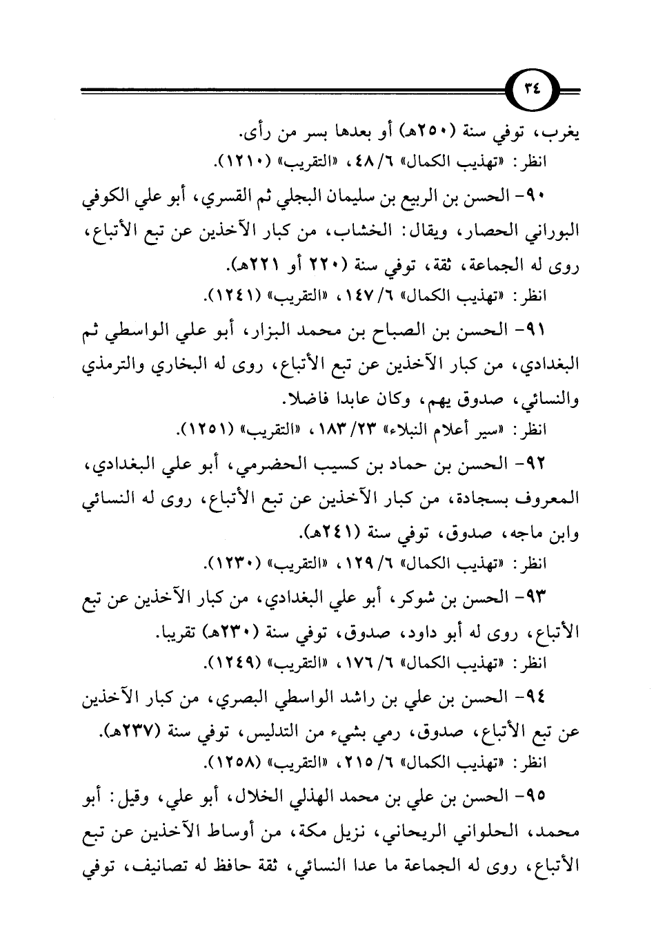 92 - الحسن بن حماد بن كسيب الحضرمي، أبو علي البغدادي، المعروف بسجادة، من كبار الآخذين عن تبع الأتباع، روى له النسائي وابن ماجة، صدوق، توفي سنة (241 هـ).