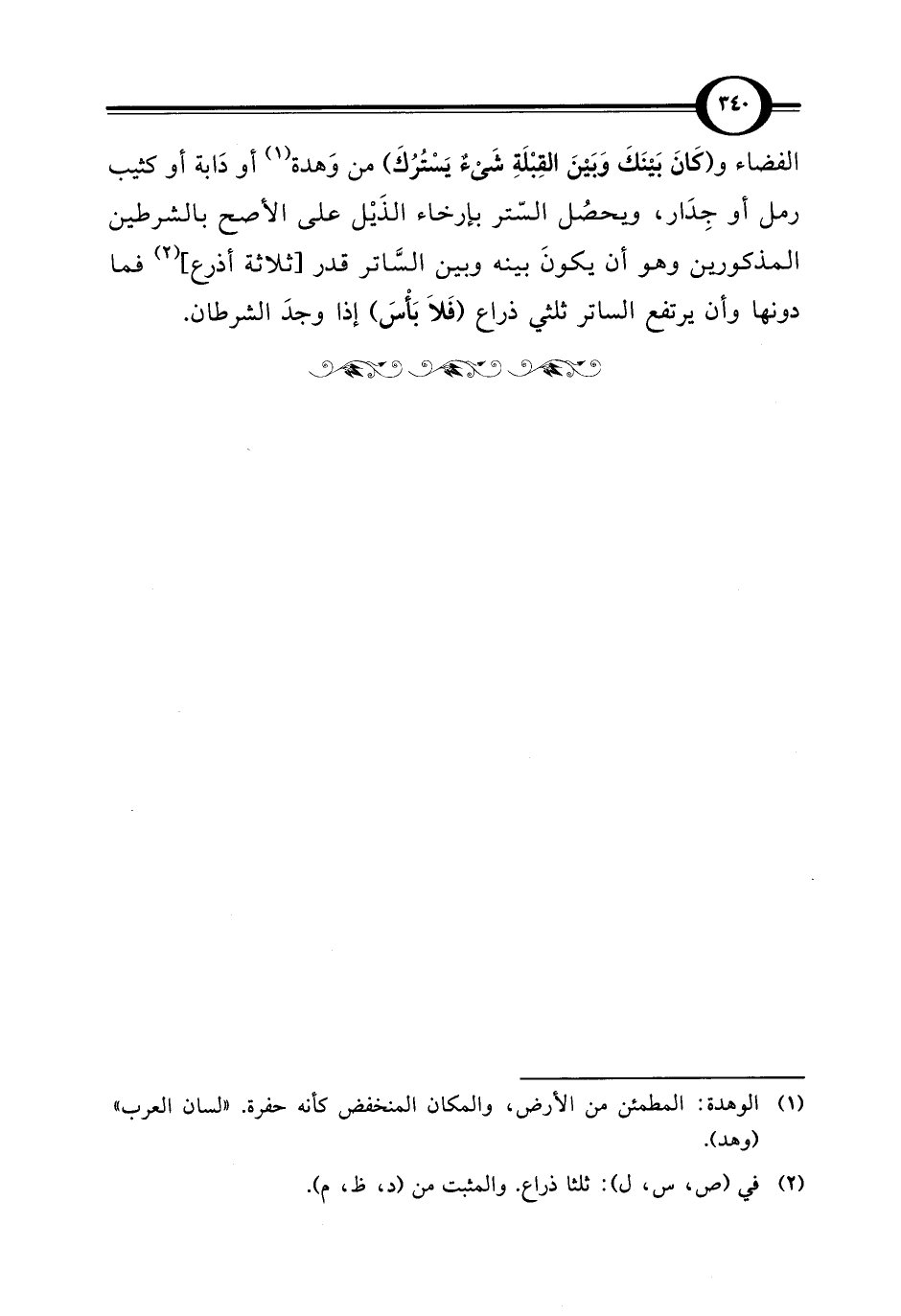 الفضاء و (كَانَ بَينَكَ وَبَينَ القِبْلَةِ شَيْءٌ يَسْتُرُكَ) من وَهدة (¬1) أو دَابة أو كثيب رمل أو جِدَار، ويحصُل السّتر بإرخاء الذَيْل على الأصح بالشرطين المذكورين وهو أن يكونَ بينه وبين السَّاتر قدر [ثلاثة أذرع] (¬2) فما دونها وأن يرتفع الساتر ثلثي ذراع (فَلَا بَأْسَ) إذا وجدَ الشرطان.