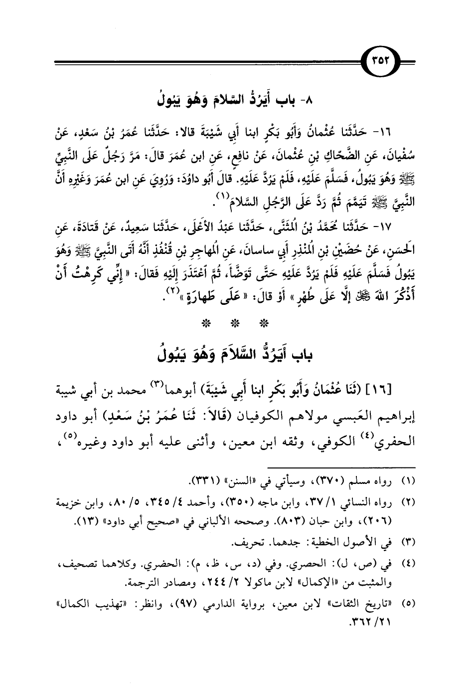 16 - حَدَّثَنا عُثْمانُ وَأَبُو بَكْرٍ ابنا أَبِي شَيْبَةَ قالا: حَدَّثَنا عُمَر بْن سَعْدٍ، عَنْ سُفْيانَ، عَنِ الضَّحّاكِ بْنِ عُثْمانَ، عَنْ نافِعٍ، عَنِ ابن عُمَرَ قالَ: مَرَّ رَجُلٌ عَلَى النَّبِيِّ - صلى الله عليه وسلم - وَهُوَ يَبُولُ، فَسَلَّمَ عَلَيْهِ، فَلَمْ يَرُدَّ عَلَيْهِ. قالَ أَبُو داوُدَ: وَرُوِيَ عَنِ ابن عُمَرَ وَغَيْرِهِ أَنَّ النَّبِيَّ - صلى الله عليه وسلم - تَيَمَّمَ ثُمَّ رَدَّ عَلَى الرَّجُلِ السَّلامَ (¬1).