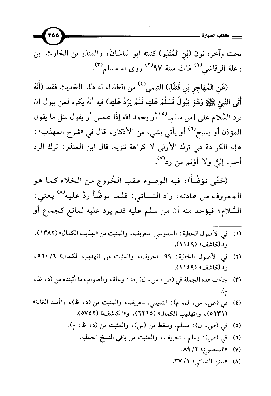 (عَنِ المُهَاجِرِ بْنِ قُنْفُذٍ) التيمي (¬4) من الطلقاء له هذا الحَديث فقط (أَنَّهُ أَتَى النَّبِيَّ - صلى الله عليه وسلم - وَهُوَ يَبُولُ فَسَلَّمَ عَلَيهِ فَلَمْ يَرُدَّ عَلَيْهِ) فيه أنهُ يكره لمن يبول أن يرد السَّلام على [من سلم] (¬5) أو يحمد الله إذَا عطس أو يقول مثل ما يقول المؤذن أو يسبح (¬6) أو يأتي بشيء من الأذكار، قال في "شرح المهذب": هذِه الكراهة هي ترك الأولى لا كراهة تنزيه. قال ابن المنذر: ترك الرد أحب إليَّ ولا أؤثم من رد (¬7).