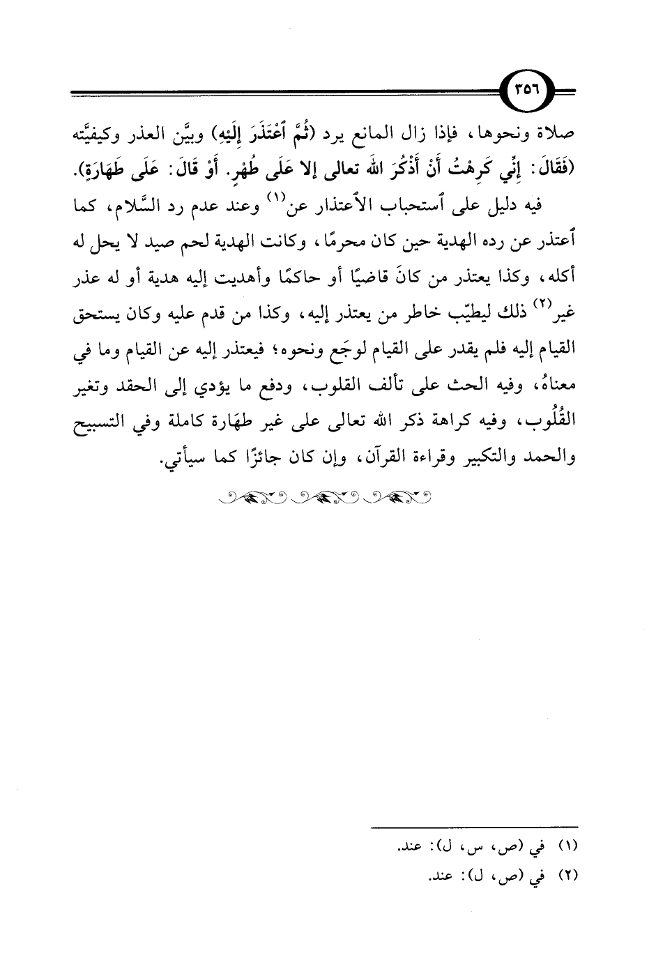 صلاة ونحوها، فإذا زال المانع يرد (ثُمَّ اعْتَذَرَ إِلَيْهِ) وبيَّن العذر وكيفيَّته (فَقَالَ: إِنِّي كَرِهْتُ أَنْ أَذْكُرَ الله تعالى إلا عَلَى طُهْرٍ. أَوْ قَالَ: عَلَى طَهَارَةٍ).
