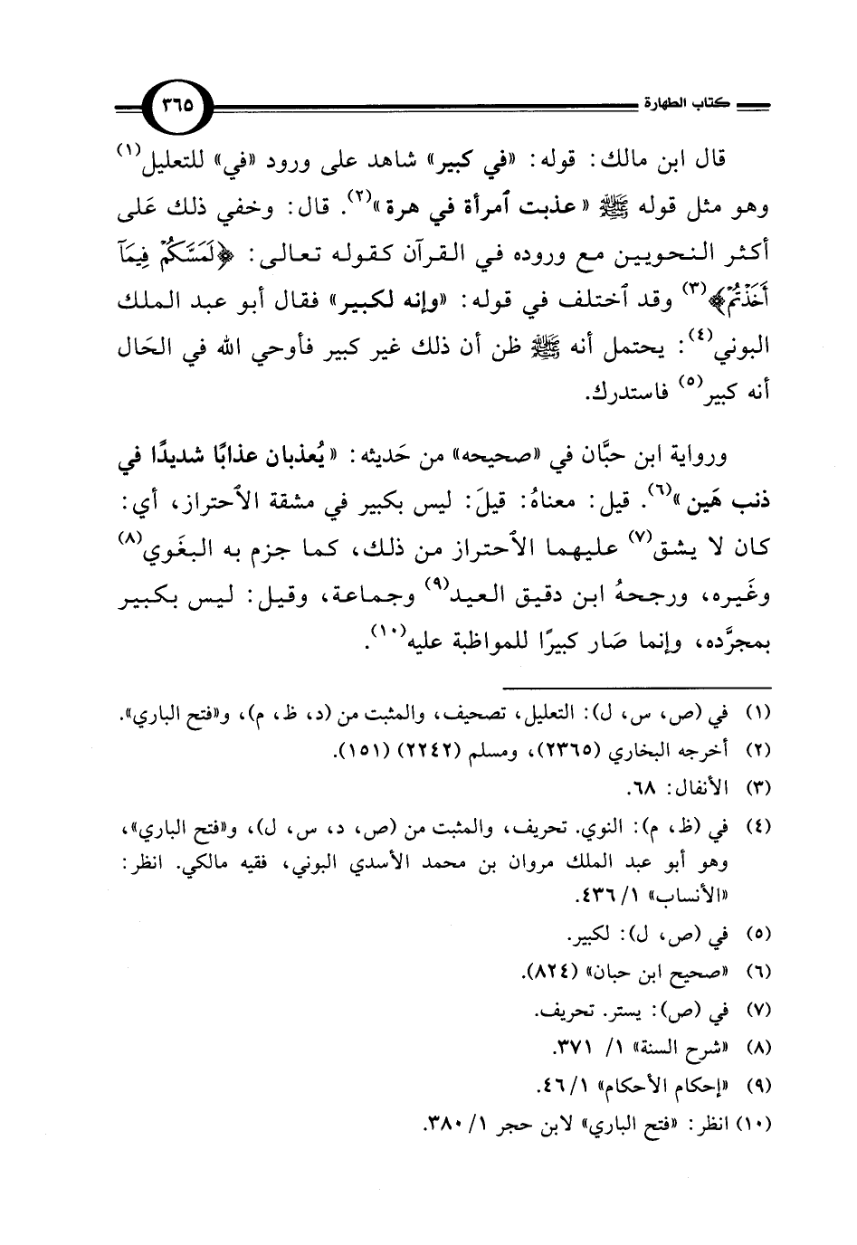 ورواية ابن حبَّان في "صحيحه" من حَديثه: " يُعذبان عذابًا شديدًا في ذنب هَين" (¬6). قيل: معناهُ: قيلَ: ليس بكبير في مشقة الاحتراز، أي: كان لا يشق (¬7) عليهما الاحتراز من ذلك، كما جزم به البغَوي (¬8) وغَيره، ورجحهُ ابن دقيق العيد (¬9) وجماعة، وقيل: ليس بكبير بمجرَّده، وإنما صَار كبيرًا للمواظبة عليه (¬10).