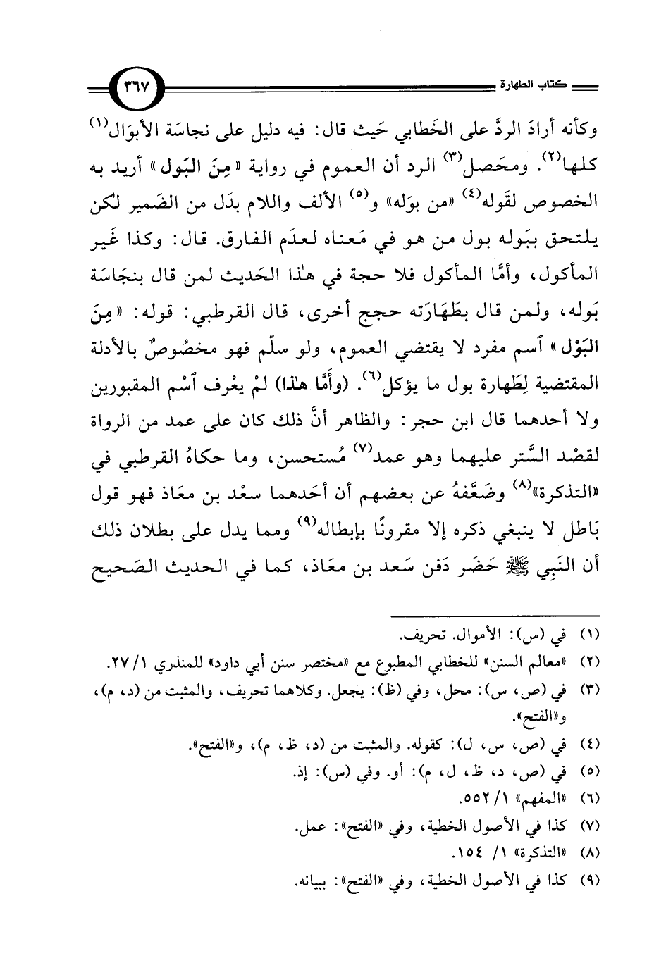 وكأنه أرادَ الردَّ على الخَطابي حَيث قال: فيه دليل على نجاسَة الأبوَال (¬1) كلها (¬2). ومحَصل (¬3) الرد أن العموم في رواية "مِنَ البَول" أريد به الخصوص لقَوله (¬4) "من بوَله" و (¬5) الألف والسلام بدَل من الضَمير لكن يلتحق ببَوله بول من هو في مَعناه لعدَم الفارق. قال: وكذا غَير المأكول، وأمَّا المأكول فلا حجة في هذا الحَديث لمن قال بنجَاسَة بَوله، ولمن قال بطَهَارَته حجج أخرى، قال القرطبي: قوله: "مِنَ البَوْل" اسم مفرد لا يقتضي العموم، ولو سلّم فهو مخصُوصٌ بالأدلة المقتضية لِطَهارة بول ما يؤكل (¬6). (وأَمَّا هذا) لمْ يعْرف اسْم المقبورين ولا أحدهما قال ابن حجر: والظاهر أنَّ ذلك كان على عمد من الرواة لقصْد السَّتر عليهما وهو عمد (¬7) مُستحسن، وما حكاهُ القرطبي في "التذكرة" (¬8) وضَعَّفهُ عن بعضهم أن أحَدهما سعْد بن معَاذ فهو قول بَاطل لا ينبغي ذكره إلا مقرونًا بإبطاله (¬9) ومما يدل على بطلان ذلك أن النَّبِيّ - صلى الله عليه وسلم - حَضَر دَفن سَعد بن معَاذ، كما في الحديث الصَحيح