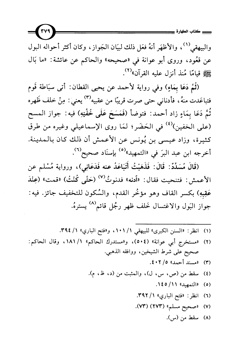 (ثُمَّ دَعَا بِمَاءٍ) وفي رواية لأحمد عن يحيى القطان: أتى سبَاطة قَوم فتباعَدت منهُ، فأدناني حتى صوت قريبًا من عقبيه (¬3) يعني: مِنْ خلف ظَهره ثُمَّ دَعَا بِمَاءٍ زاد أحمد: فتوضأ (فَمَسَحَ عَلَى خُفَّيْهِ) فيه: جواز المسح (على الخفين) (¬4) في الحَضَر؛ لمَا روى الإسماعيلي وغيره من طرق كثيرة، وزاد عيسى بن يُونس عن الأعمش أن ذلك كان بالمدينة. أخرجه ابن عبد البرَ في "التمهيد" (¬5) بإسنَاد صحيح (¬6).