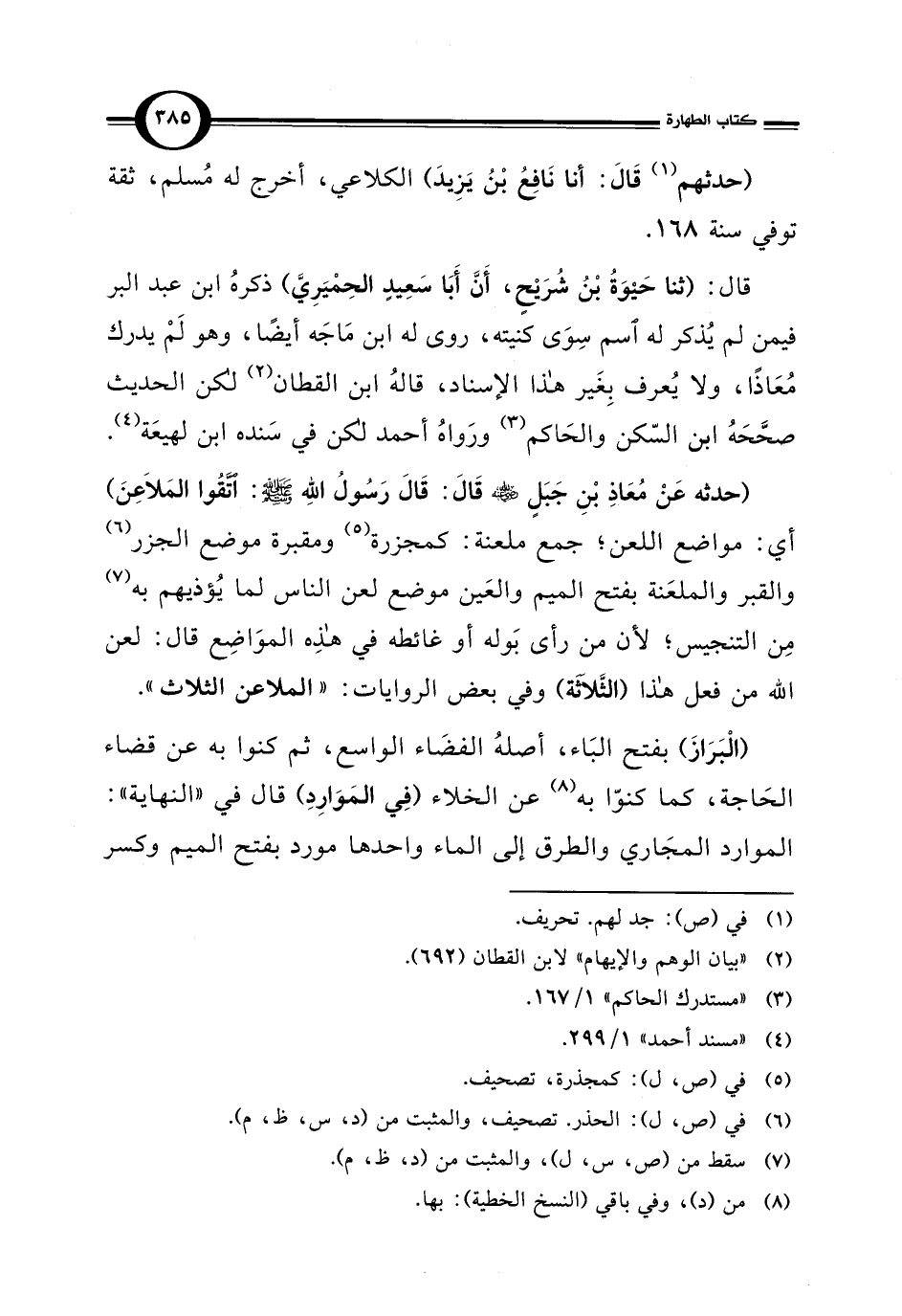 (حدثه عَنْ مُعَاذِ بْنِ جَبَلٍ - رضي الله عنه - قَالَ: قَالَ رَسُولُ الله - صلى الله عليه وسلم -: اتقُوا المَلاَعِنَ) أي: مواضع اللعن؛ جمع ملعنة: كمجزرة (¬5) ومقبرة موضع الجزر (¬6) والقبر والملعَنة بفتح الميم والعَين موضع لعن الناس لما يُؤذيهم به (¬7) مِن التنجيس؛ لأن من رأى بَوله أو غائطه في هذِه الموَاضِع قال: لعن الله من فعل هذا (الثَّلاثة) وفي بعض الروايات: "الملاعن الثلاث".