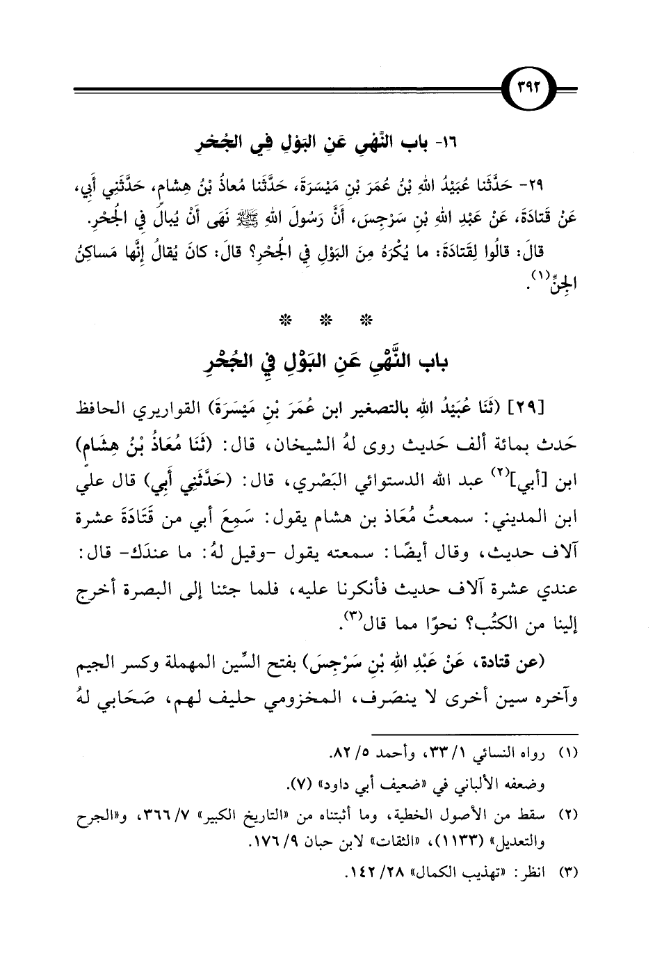 29 - حَدَّثَنا عُبَيْدُ اللهِ بْن عُمَرَ بْنِ مَيْسَرَةَ، حَدَّثَنا مُعاذ بْنُ هِشامٍ، حَدَّثَنِي أَبِي، عَنْ قَتادَةَ، عَنْ عَبْدِ اللهِ بْنِ سَرْجِسَ، أَنَّ رَسُولَ اللهِ - صلى الله عليه وسلم - نَهَى أَنْ يُبالَ في الجُحْرِ.