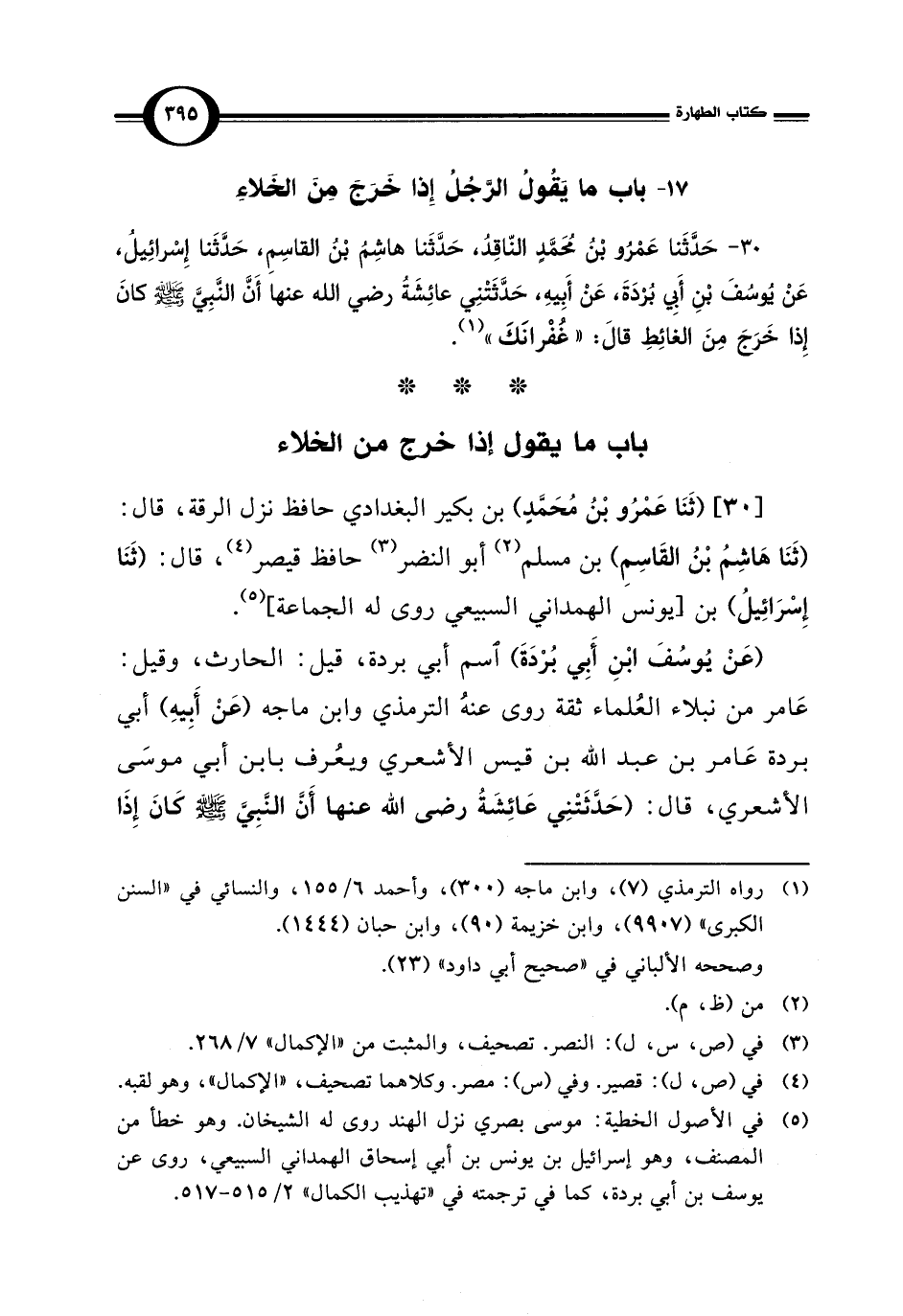 30 - حَدَّثَنا عَمْرُو بْنُ مُحَمَّدٍ, النّاقِدُ، حَدَّثَنا هاشِمُ بْنُ القاسِمِ، حَدَّثَنا إِسْرائِيلُ، عَنْ يُوسُفَ بْنِ أَبِي بُرْدَةَ، عَنْ أَبِيهِ، حَدَّثَتْنِي عائِشَةُ رضي الله عنها أَنَّ النَّبِي - صلى الله عليه وسلم - كانَ إِذا خَرَجَ مِنَ الغائِطِ قالَ: "غُفْرانَكَ" (¬1).