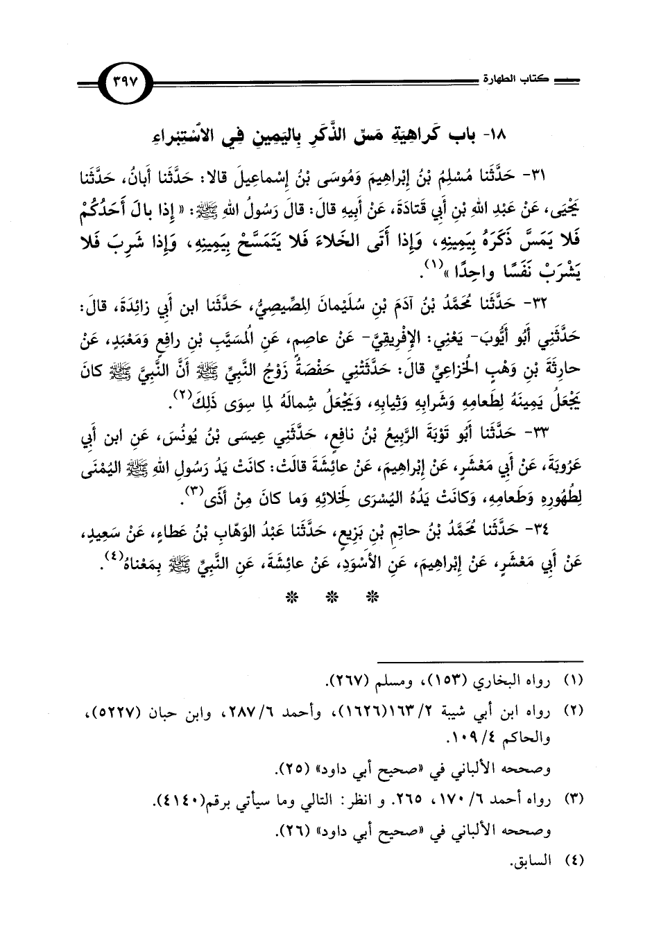 33 - حَدَّثَنا أَبُو تَوْبَةَ الرَّبِيعُ بْنُ نافِعٍ، حَدَّثَنِي عِيسَى بْنُ يُونُسَ، عَنِ ابن أَبِي عَرُوبَةَ، عَنْ أَبِي مَعْشَرٍ، عَنْ إِبْراهِيمَ، عَنْ عائِشَةَ قالَتْ: كانَتْ يَدُ رَسُولِ اللهِ - صلى الله عليه وسلم - اليُمْنَى لِطُهُورِهِ وَطَعامِهِ، وَكانَتْ يَدُهُ اليُسْرَى لِخَلائِهِ وَما كانَ مِنْ أَذًى (¬3).