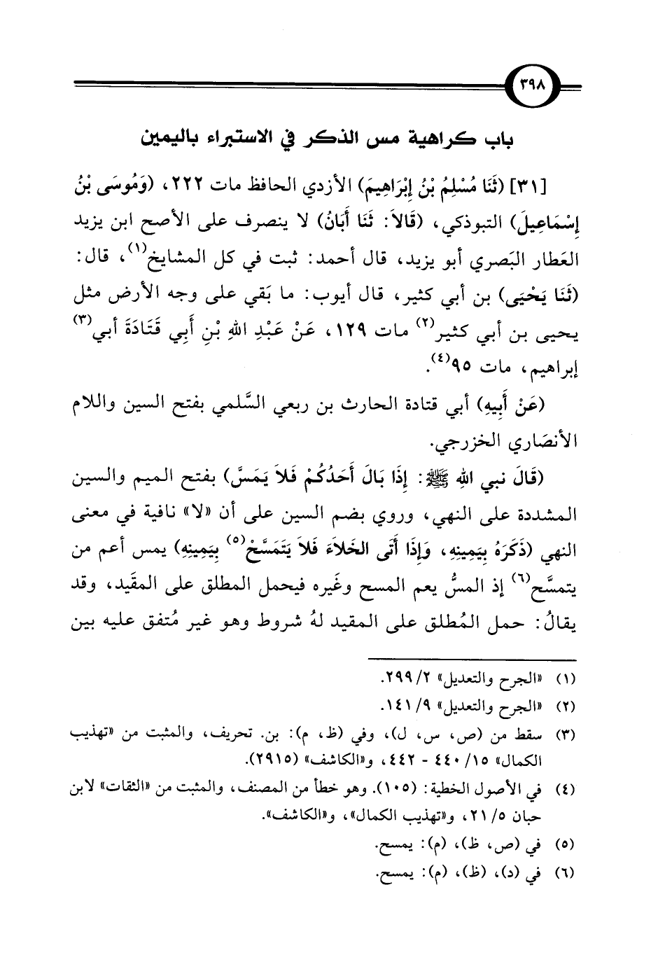 [31] (ثَنَا مُسْلِمُ بْنُ إِبْرَاهِيمَ) الأزدي الحافظ مات 222، (وَمُوسَى بْنُ إِسْمَاعِيلَ) التبوذكي، (قَالاَ: ثَنَا أَبَانُ) لا ينصرف على الأصح ابن يزيد العَطار البَصري أبو يزيد، قال أحمد: ثبت في كل المشايخ (¬1)، قال: (ثَنَا يَحْيَى) بن أبي كثير، قال أيوب: ما بَقي على وجه الأرض مثل يحيى بن أبي كثير (¬2) مات 129، عَنْ عَبْدِ اللهِ بْنِ أَبِي قَتَادَةَ أبي (¬3) إبراهيم، مات 95 (¬4).