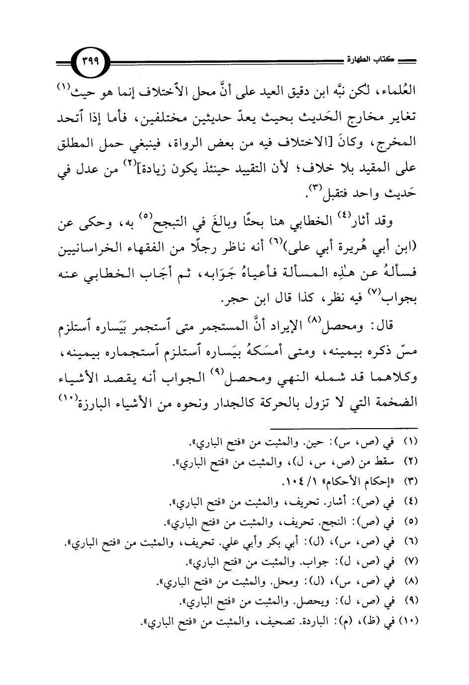وقد أثار (¬4) الخطابي هنا بحثًا وبالغَ في التبجح (¬5) به، وحكى عن (ابن أبي هُريرة أبي على) (¬6) أنه ناظر رجلًا من الفقهاء الخراسانيين فسألهُ عن هذِه المسألة فأعياهُ جَوَابه، ثم أجَاب الخطابي عنه بجواب (¬7) فيه نظر، كذا قال ابن حجر.