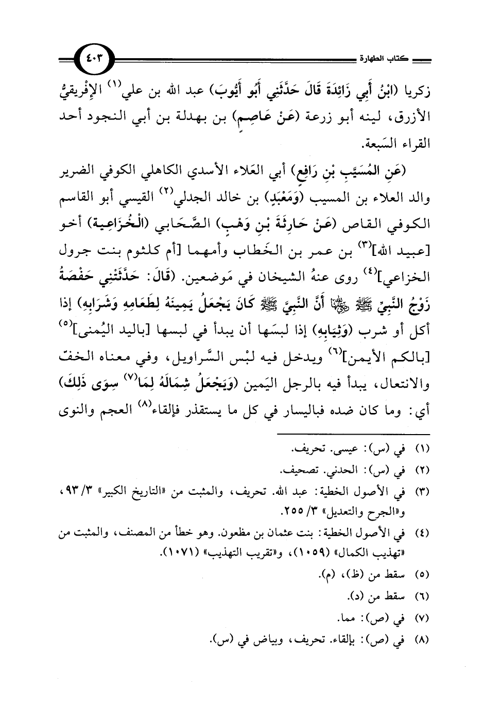 زكريا (ابْنُ أَبِي زَائِدَةَ قَالَ حَدَّثَنِي أَبُو أَيُّوبَ) عبد الله بن علي (¬1) الإِفْريقيُّ الأزرق، لينه أبو زرعة (عَنْ عَاصِمٍ) بن بهدلة بن أبي النجود أحد القراء السَبعة.