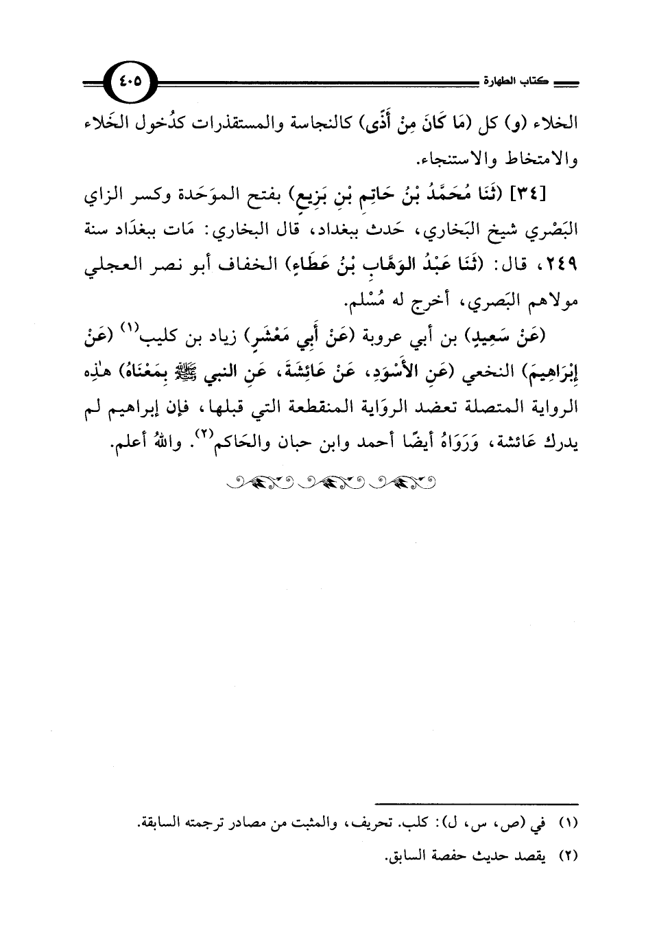 [34] (ثَنَا مُحَمَّدُ بْنُ حَاتِمِ بْنِ بَزِيعٍ) بفتح الموَحَدة وكسر الزاي البَصْري شيخ البَخاري، حَدث ببغداد، قال البخاري: مَات ببغدَاد سنة 249، قال: (ثَنَا عَبْدُ الوَهَّابِ بْنُ عَطَاءٍ) الخفاف أبو نصر العجلي مولاهم البَصري، أخرج له مُسْلم.