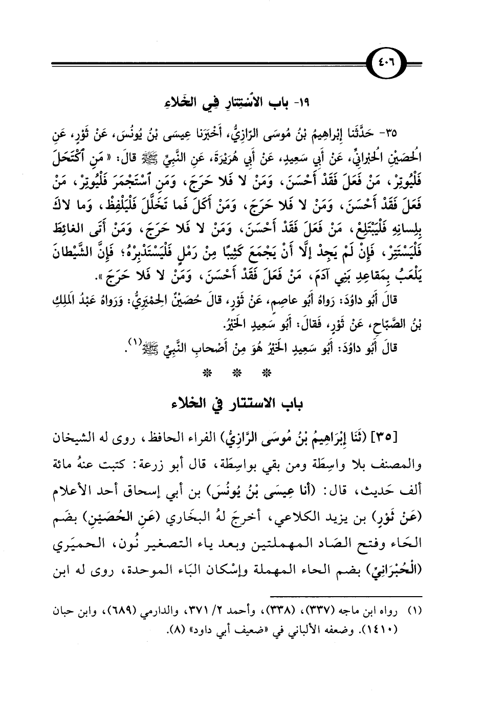 [35] (ثَنَا إِبْرَاهِيمُ بْنُ مُوسَى الرَّازِيُّ) الفراء الحافظ، روى له الشيخان والمصنف بلا واسِطَة ومن بقي بواسِطَة، قال أبو زرعة: كتبت عنهُ مائة ألف حَديث، قال: (أنا عِيسَى بْنُ يُونُسَ) بن أبي إسحاق أحد الأعلام (عَنْ ثَوْرٍ) بن يزيد الكلاعي، أخرجَ لهُ البخَاري (عَنِ الحُصَينِ) بضَم الحَاء وفتح الصَاد المهملتين وبعد ياء التصغير نُون، الحميَري (الْحُبْرَانِيِّ) بضم الحاء المهملة وإسْكان البَاء الموحدة، روى له ابن